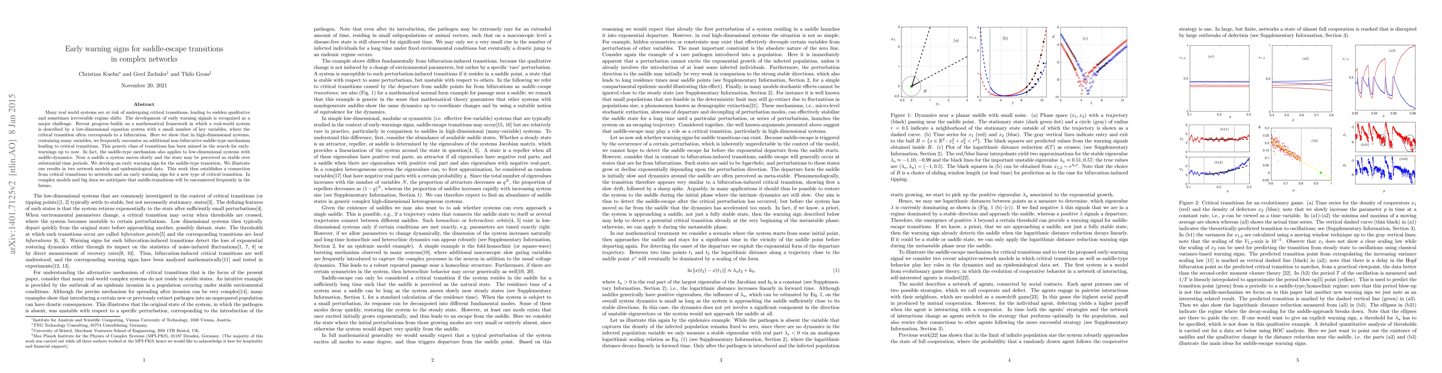 This paper develops early warning signs for saddle-escape transitions, a previously overlooked critical transition mechanism in complex networks. The authors propose a new method to detect these transitions and illustrate its application through network models and epidemiological data.
