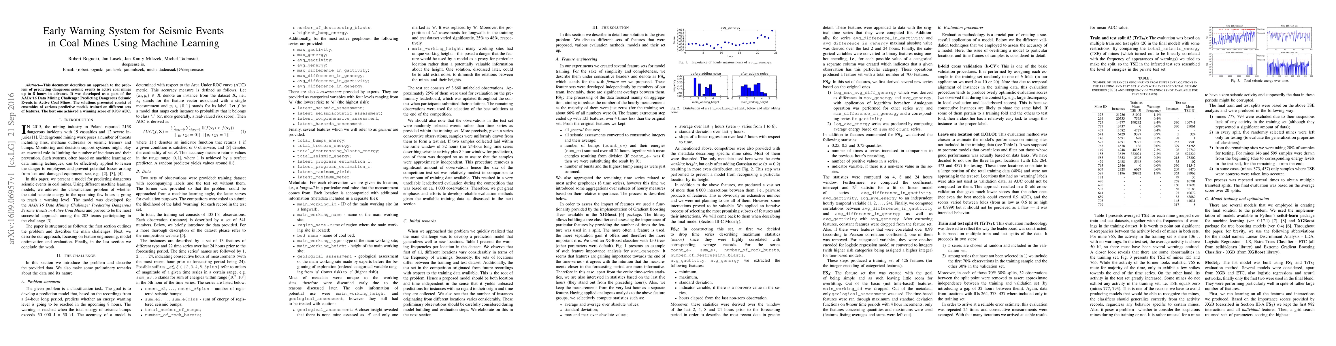 This document describes an approach to the problem of predicting dangerous seismic events in active coal mines up to 8 hours in advance. It was developed as a part of the AAIA'16 Data Mining Challenge: Predicting Dangerous Seismic Events in Active Coal Mines. The solutions presented consist of ensembles of various predictive models trained on different sets of features. The best one achieved a winning score of 0.939 AUC.