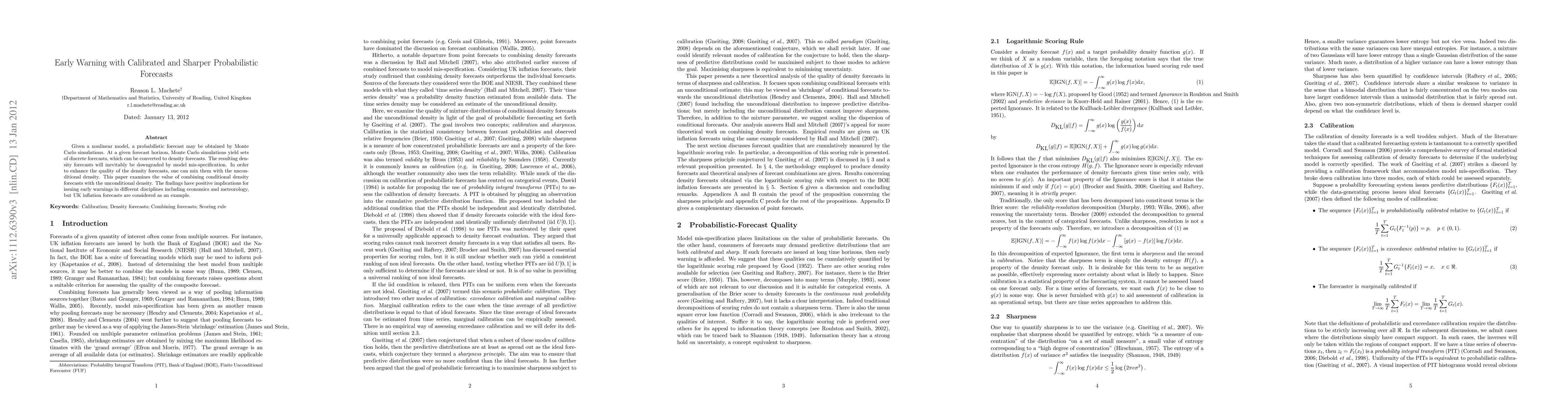 Given a nonlinear model, a probabilistic forecast may be obtained by Monte Carlo simulations. At a given forecast horizon, Monte Carlo simulations yield sets of discrete forecasts, which can be converted to density forecasts. The resulting density forecasts will inevitably be downgraded by model mis-specification. In order to enhance the quality of the density forecasts, one can mix them with the unconditional density. This paper examines the value of combining conditional density forecasts with the unconditional density. The findings have positive implications for issuing early warnings in different disciplines including economics and meteorology, but UK inflation forecasts are considered as an example.