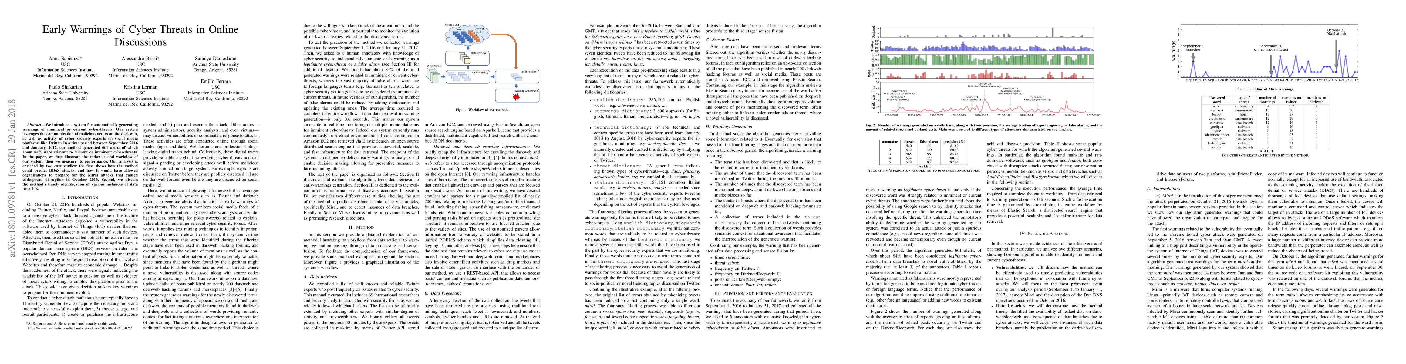This paper presents a system for automatically generating early warnings of cyber threats by analyzing darkweb communications and social media activity. The system generated 661 alerts between September 2016 and January 2017, with 84% relevance, and demonstrated its effectiveness in predicting DDoS attacks and identifying data breaches.