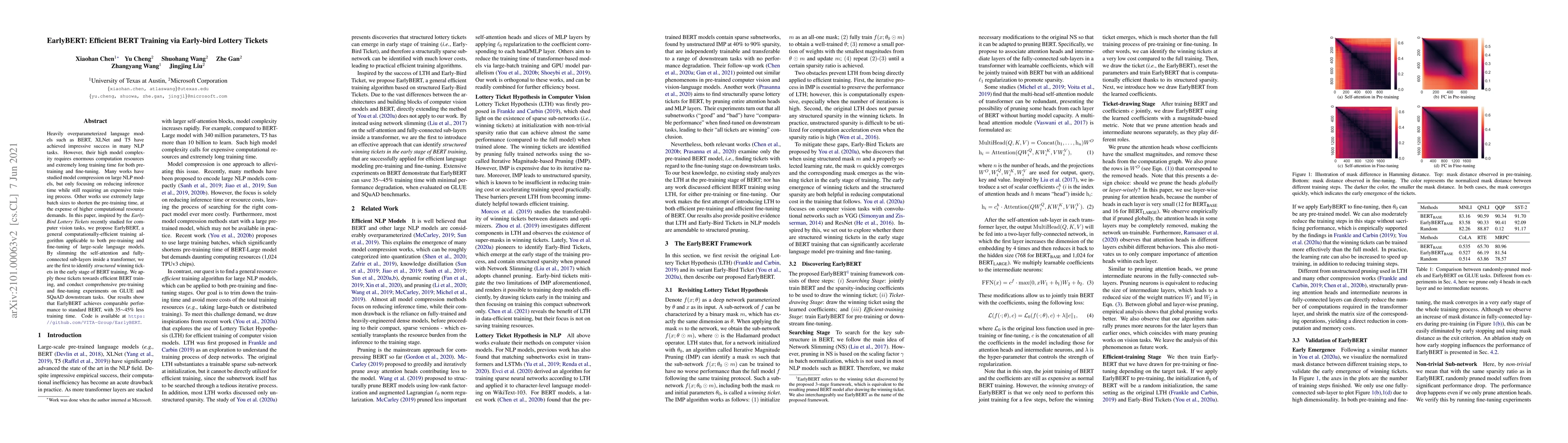 EarlyBERT proposes a computationally-efficient training method for large language models like BERT, identifying winning tickets early in training to reduce training time by 35~45% while maintaining performance on GLUE and SQuAD tasks.