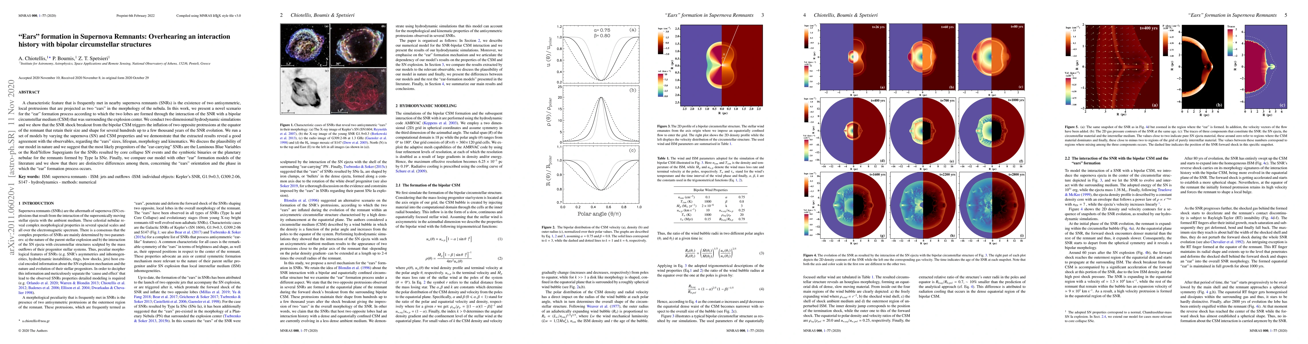 This paper proposes a new model for the formation of "ears" in supernova remnants (SNRs) through the interaction with bipolar circumstellar medium (CSM). The authors use hydrodynamic simulations to demonstrate that SNR shock breakout from the CSM leads to the formation of two opposite protrusions, which match observed "ears" in terms of size, lifespan, and morphology.
