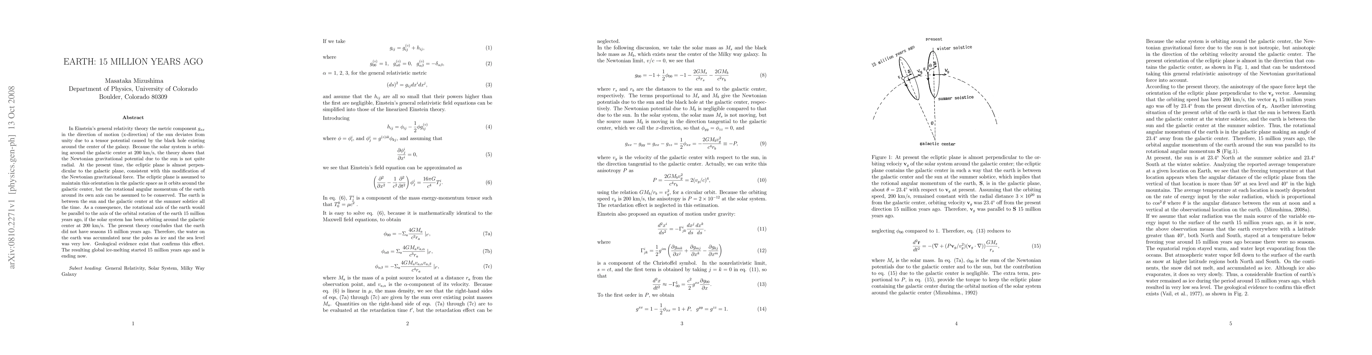In Einstein's general relativity theory the metric component gxx in the direction of motion (x-direction) of the sun deviates from unity due to a tensor potential caused by the black hole existing around the center of the galaxy. Because the solar system is orbiting around the galactic center at 200 km/s, the theory shows that the Newtonian gravitational potential due to the sun is not quite radial. At the present time, the ecliptic plane is almost perpendicular to the galactic plane, consistent with this modification of the Newtonian gravitational force. The ecliptic plane is assumed to maintain this orientation in the galactic space as it orbits around the galactic center, but the rotational angular momentum of the earth around its own axis can be assumed to be conserved. The earth is between the sun and the galactic center at the summer solstice all the time. As a consequence, the rotational axis of the earth would be parallel to the axis of the orbital rotation of the earth 15 million years ago, if the solar system has been orbiting around the galactic center at 200 km/s. The present theory concludes that the earth did not have seasons 15 million years ago. Therefore, the water on the earth was accumulated near the poles as ice and the sea level was very low. Geological evidence exists that confirms this effect. The resulting global ice-melting started 15 million years ago and is ending now.
