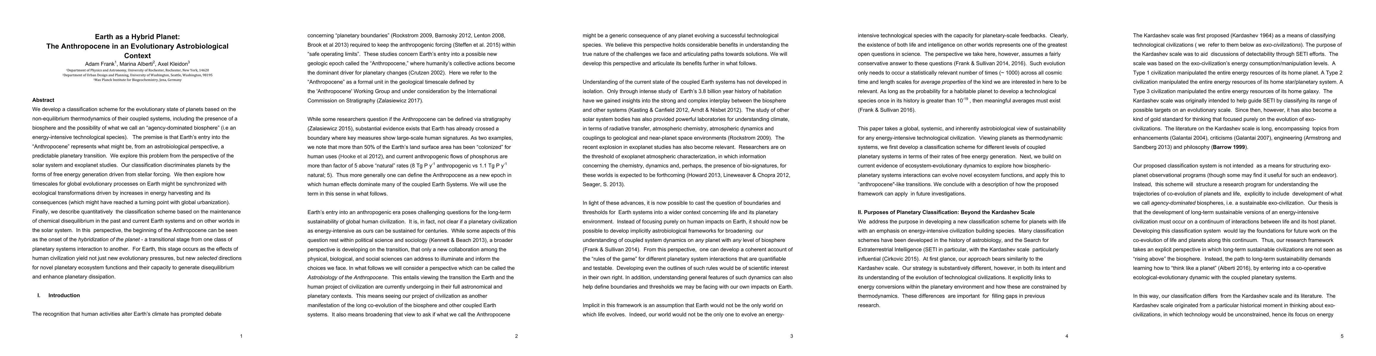 This paper proposes a classification scheme for planetary evolutionary states based on non-equilibrium thermodynamics, focusing on Earth's transition into the Anthropocene as a predictable astrobiological shift. It examines how human technological activity is reshaping Earth's ecological processes and planetary energy dynamics, marking a new stage of planetary hybridization.