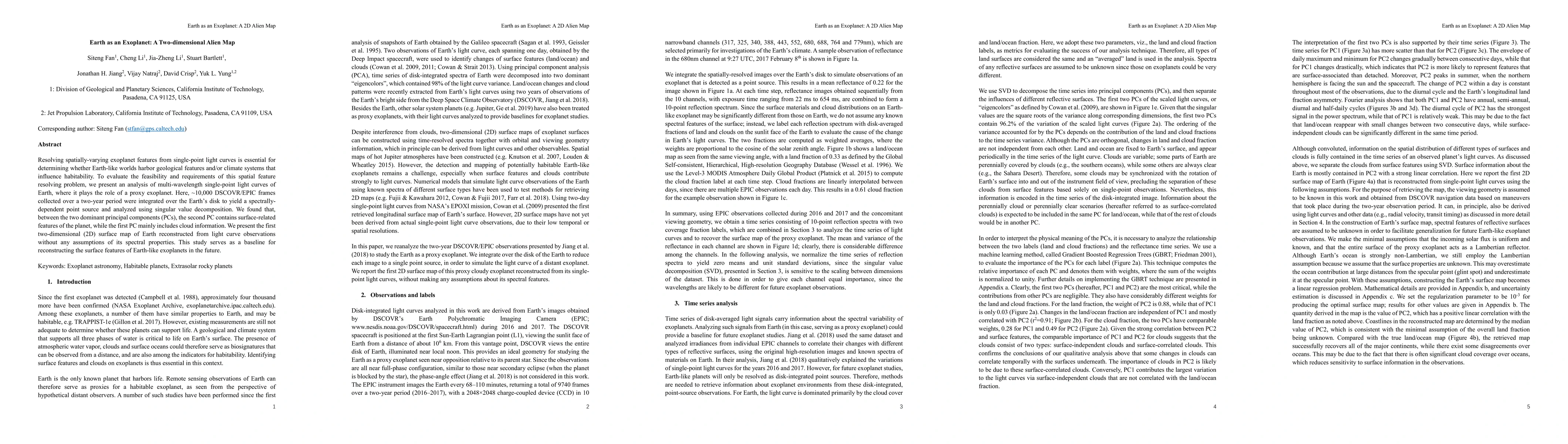 This paper analyzes Earth's multi-wavelength light curves to simulate exoplanet feature resolution, revealing that the second principal component of the data contains surface-related features, while the first includes cloud information. It presents the first 2D surface map of Earth reconstructed from light curve data, establishing a baseline for future Earth-like exoplanet studies.