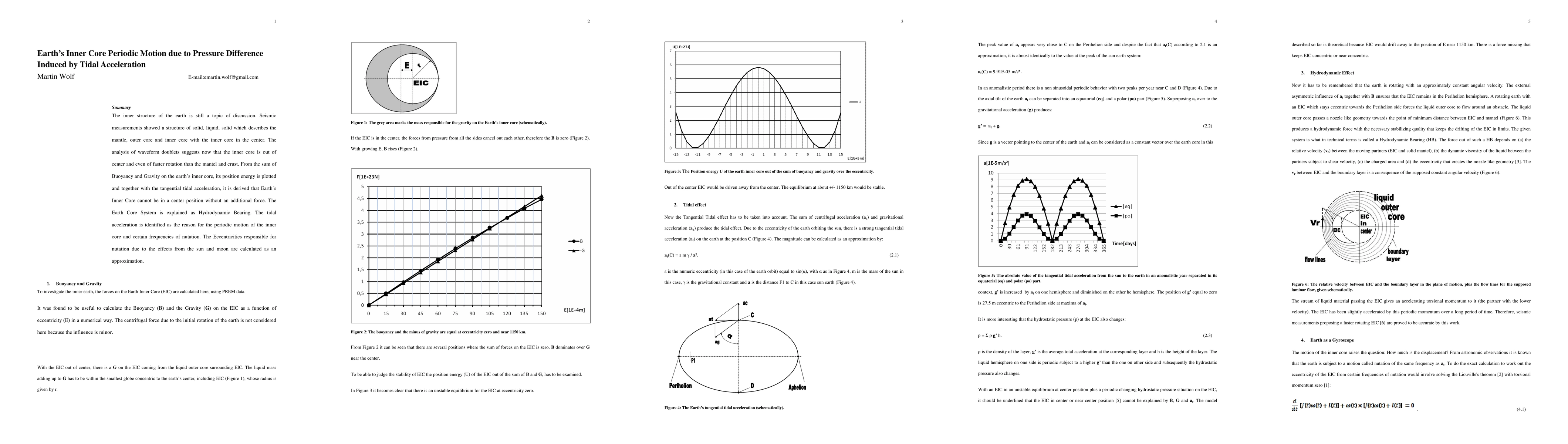 This paper explores the periodic motion of Earth's inner core driven by tidal acceleration, suggesting that the inner core is off-center and rotates faster than the mantle and crust. The analysis attributes this motion to the hydrodynamic behavior of the Earth Core System, with tidal forces causing periodic nutation and eccentricity.