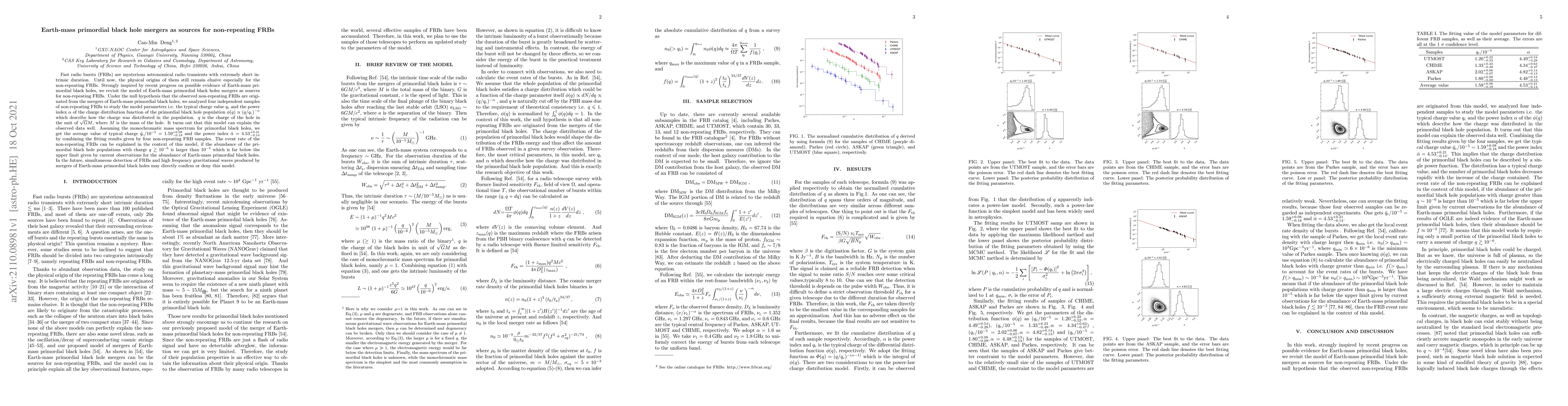 This paper explores the possibility that non-repeating fast radio bursts (FRBs) originate from the mergers of Earth-mass primordial black holes. The study finds that this model can explain observed FRB data, yielding an average charge value and power index for the black hole population, and suggests that future detection of both FRBs and gravitational waves could confirm or refute this hypothesis.