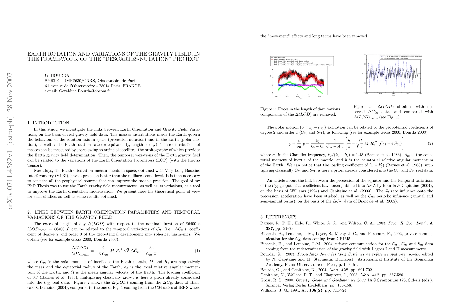 This research explores the "Descartes-Nutation" Project's aim to understand Earth's precession-nutation, focusing on Earth's dynamical flattening, lunisolar forcing coupling, geophysical fluid effects, and nutation observations. The study investigates the links between Earth Orientation Parameters and gravity field variations, using satellite orbitography and Earth gravity field measurements to enhance Earth orientation modeling precision.
