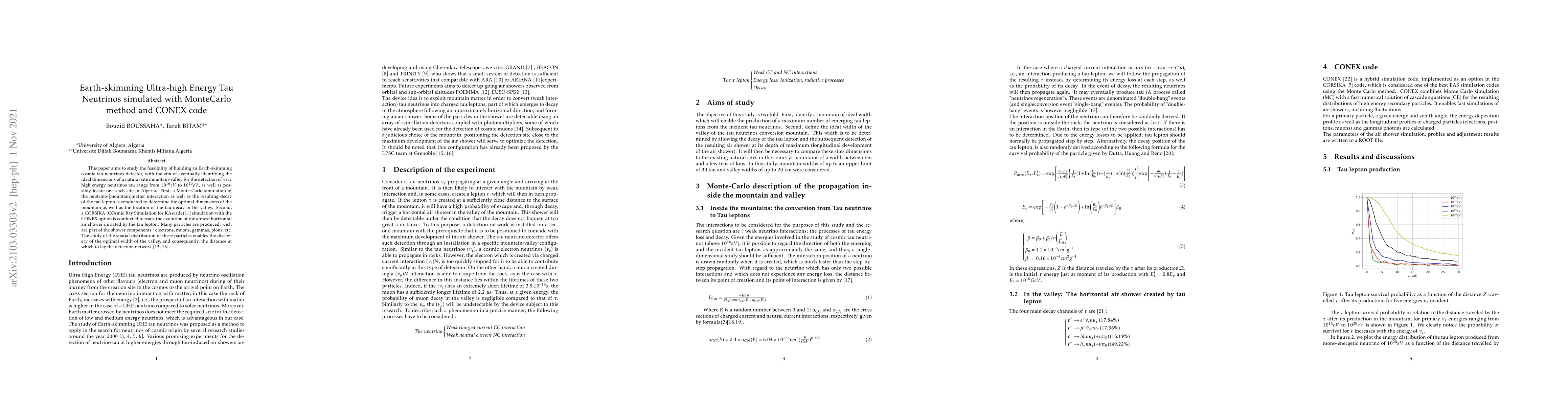 This paper aims to study the feasibility of building an Earth-skimming cosmic tau neutrinos detector, with the aim of eventually identifying the ideal dimensions of a natural site (mountainvalley) for the detection, with the energy range to be determined (evidently, the highest possible numbers range from 1015 eV to 1020 eV), and possibly locate one such site in Algeria. First, a Monte Carlo simulation of the neutrino-[mountain]matter interaction as well as the resulting decay of the tau lepton is conducted to determine the optimal dimensions of the mountain as well as the location of the tau decay in the valley. Second, a CORSIKA (COsmic Ray Simulation for KAscade) [1] simulation with the CONEX option is conducted to track the evolution of the almost horizontal air shower born from the tau lepton. Among the particles produced in the shower are: electrons, muons, gammas, pions, etc). The study of the spatial distribution of these particles enables the discovery of the optimal width of the valley, and consequently, the distance at which to lay the detection network.