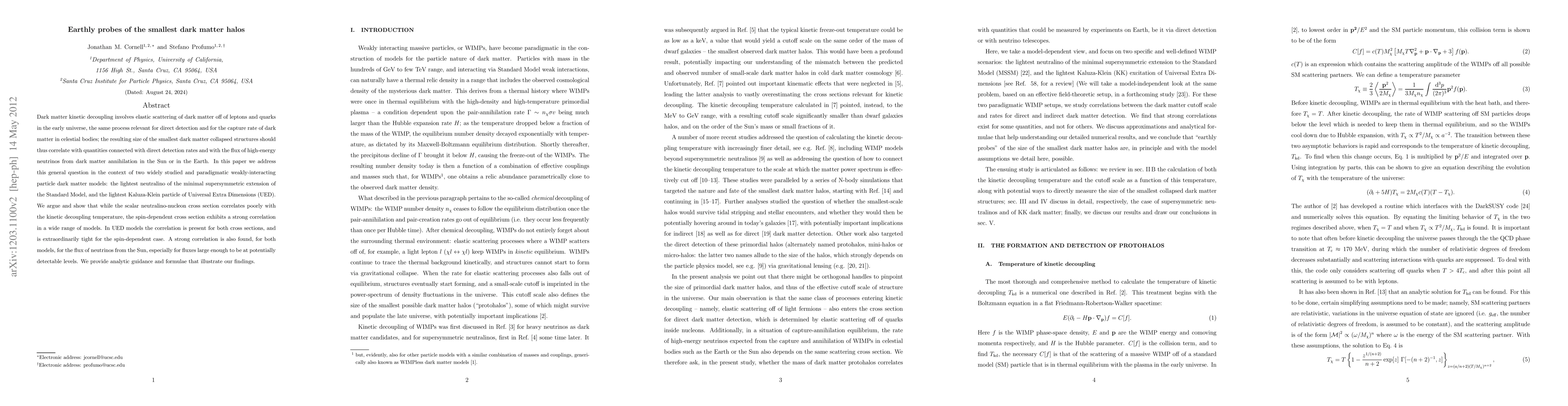 Dark matter kinetic decoupling involves elastic scattering of dark matter off of leptons and quarks in the early universe, the same process relevant for direct detection and for the capture rate of dark matter in celestial bodies; the resulting size of the smallest dark matter collapsed structures should thus correlate with quantities connected with direct detection rates and with the flux of high-energy neutrinos from dark matter annihilation in the Sun or in the Earth. In this paper we address this general question in the context of two widely studied and paradigmatic weakly-interacting particle dark matter models: the lightest neutralino of the minimal supersymmetric extension of the Standard Model, and the lightest Kaluza-Klein particle of Universal Extra Dimensions (UED). We argue and show that while the scalar neutralino-nucleon cross section correlates poorly with the kinetic decoupling temperature, the spin-dependent cross section exhibits a strong correlation in a wide range of models. In UED models the correlation is present for both cross sections, and is extraordinarily tight for the spin-dependent case. A strong correlation is also found, for both models, for the flux of neutrinos from the Sun, especially for fluxes large enough to be at potentially detectable levels. We provide analytic guidance and formulae that illustrate our findings.