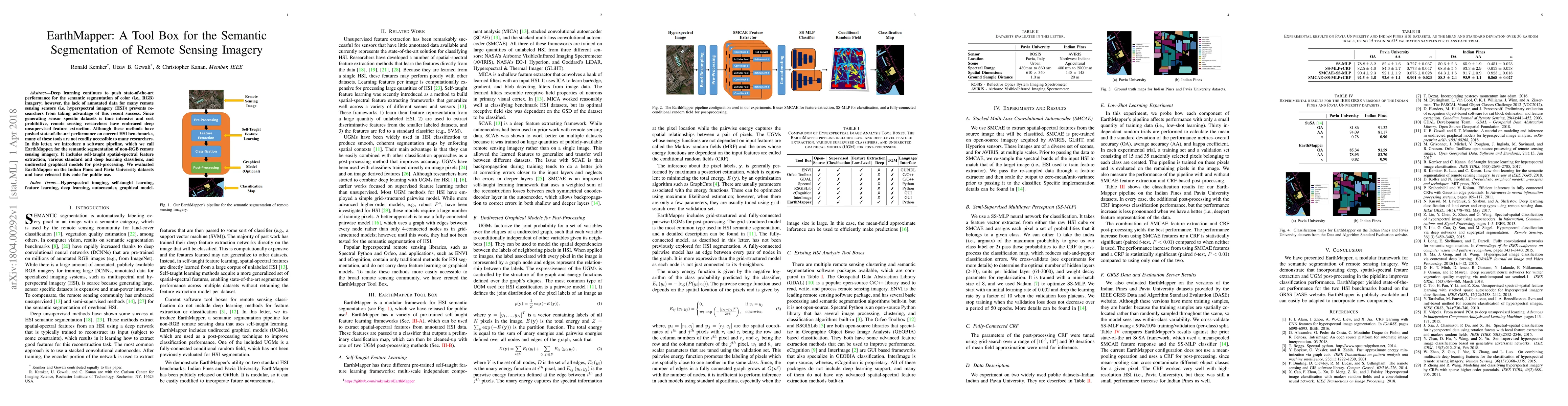 EarthMapper is a software pipeline designed for the semantic segmentation of non-RGB remote sensing imagery, including hyperspectral data, using deep unsupervised feature extraction and various classifiers. It is publicly available to facilitate research in this domain.