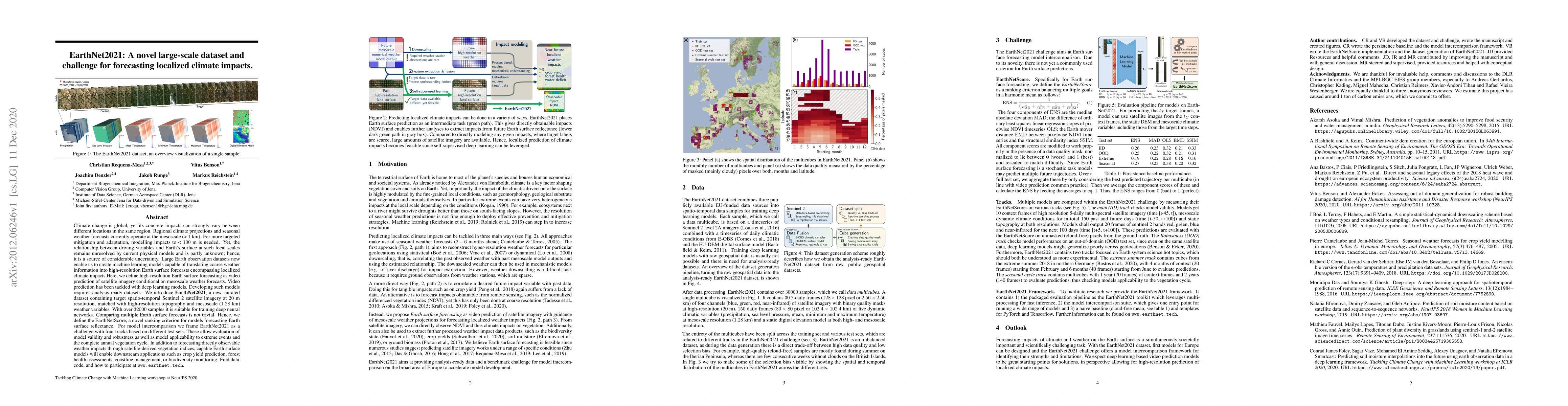 Climate change is global, yet its concrete impacts can strongly vary between different locations in the same region. Seasonal weather forecasts currently operate at the mesoscale (> 1 km). For more targeted mitigation and adaptation, modelling impacts to < 100 m is needed. Yet, the relationship between driving variables and Earth's surface at such local scales remains unresolved by current physical models. Large Earth observation datasets now enable us to create machine learning models capable of translating coarse weather information into high-resolution Earth surface forecasts. Here, we define high-resolution Earth surface forecasting as video prediction of satellite imagery conditional on mesoscale weather forecasts. Video prediction has been tackled with deep learning models. Developing such models requires analysis-ready datasets. We introduce EarthNet2021, a new, curated dataset containing target spatio-temporal Sentinel 2 satellite imagery at 20 m resolution, matched with high-resolution topography and mesoscale (1.28 km) weather variables. With over 32000 samples it is suitable for training deep neural networks. Comparing multiple Earth surface forecasts is not trivial. Hence, we define the EarthNetScore, a novel ranking criterion for models forecasting Earth surface reflectance. For model intercomparison we frame EarthNet2021 as a challenge with four tracks based on different test sets. These allow evaluation of model validity and robustness as well as model applicability to extreme events and the complete annual vegetation cycle. In addition to forecasting directly observable weather impacts through satellite-derived vegetation indices, capable Earth surface models will enable downstream applications such as crop yield prediction, forest health assessments, coastline management, or biodiversity monitoring. Find data, code, and how to participate at www.earthnet.tech .