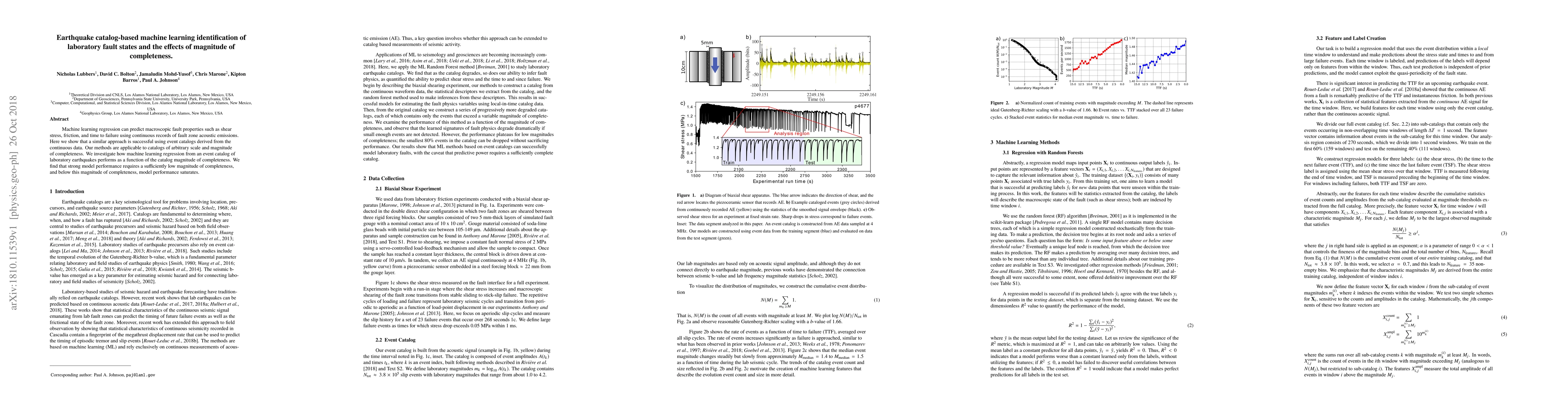 This paper demonstrates that machine learning regression can predict fault properties using earthquake event catalogs, showing that model performance is highly dependent on the catalog's magnitude of completeness, with optimal results occurring when the magnitude of completeness is sufficiently low. The study highlights the importance of catalog completeness for accurate fault state predictions.