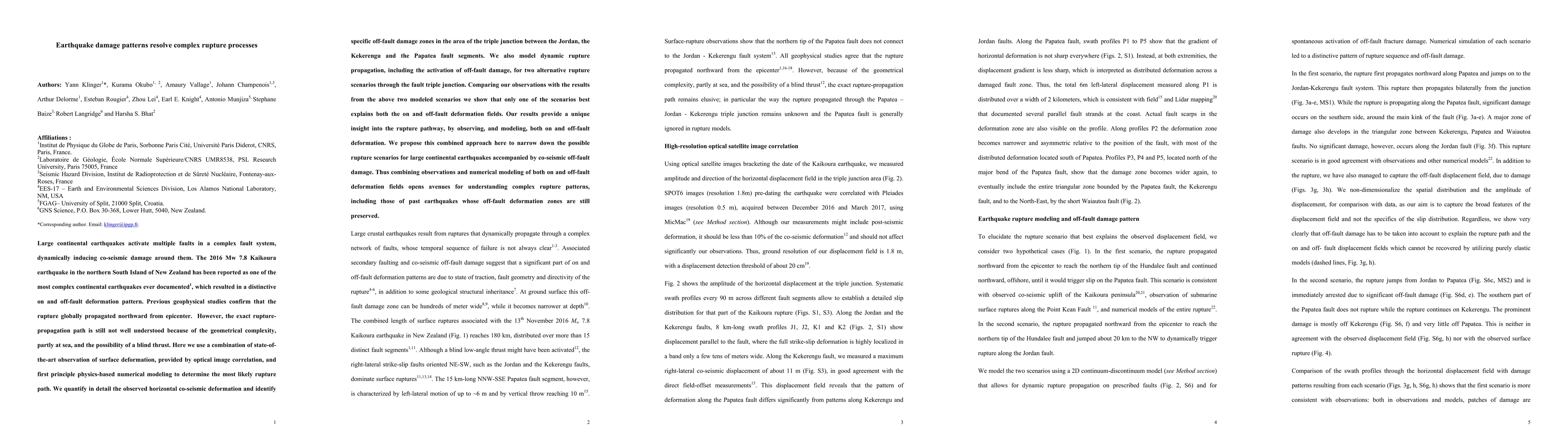 This paper investigates the complex rupture process of the 2016 Kaikoura earthquake using advanced surface deformation observations and numerical modeling. The study identifies the most likely rupture path by comparing observed on and off-fault deformation patterns with modeled scenarios, providing new insights into large continental earthquake rupture dynamics.