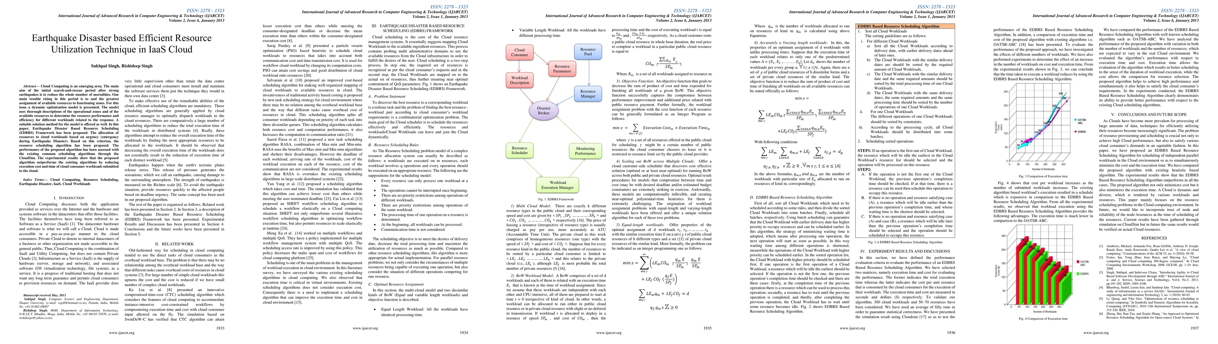 This paper proposes an Earthquake Disaster Based Resource Scheduling (EDBRS) Framework to optimize resource allocation in IaaS clouds during earthquake disaster response. The EDBRS algorithm prioritizes resource assignment based on urgency, significantly reducing execution cost and time compared to existing scheduling methods, as demonstrated through CloudSim simulations.