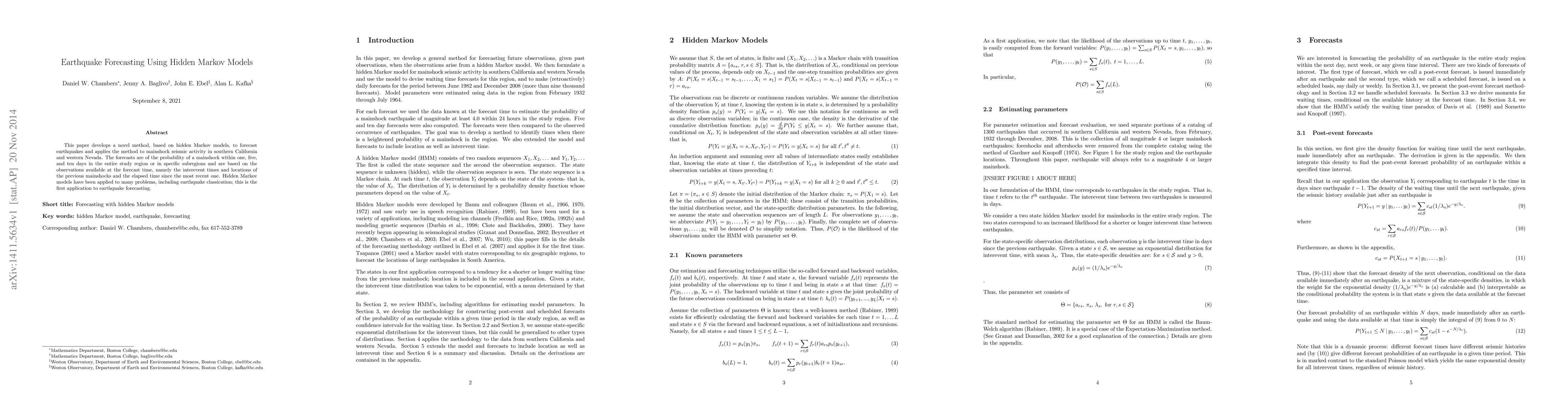 This paper introduces a novel method using hidden Markov models to forecast mainshock earthquakes in southern California and western Nevada, providing probabilities for mainshocks within one, five, and ten days. This marks the first application of hidden Markov models to earthquake forecasting.