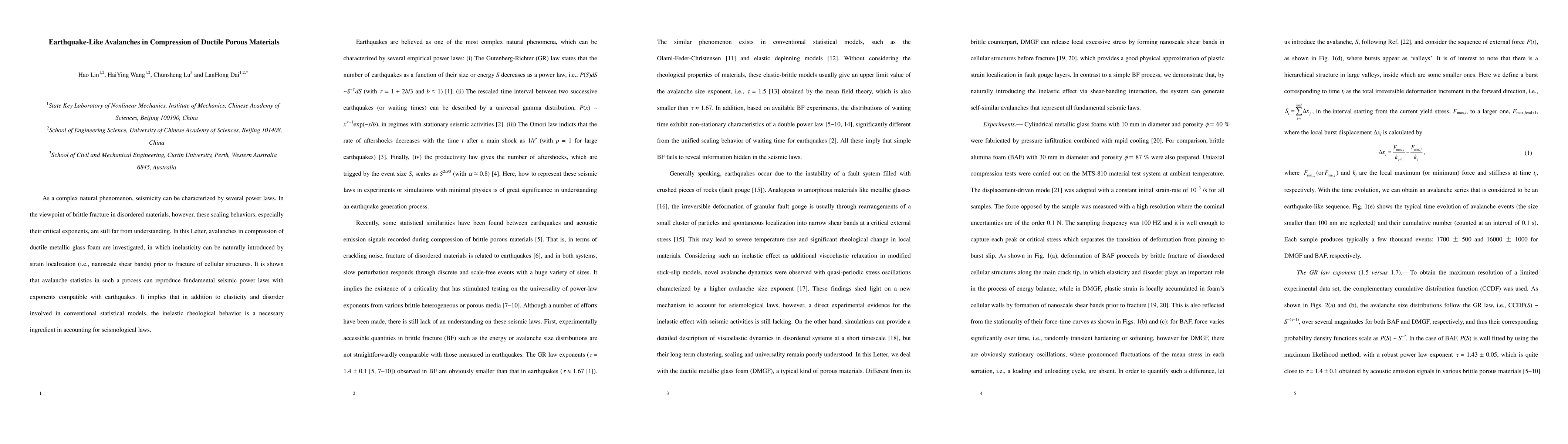 Researchers study avalanches in compressing ductile metallic glass foam and find that local plastic slip explains fundamental seismic laws, including the Gutenberg-Richter law and Omori law.