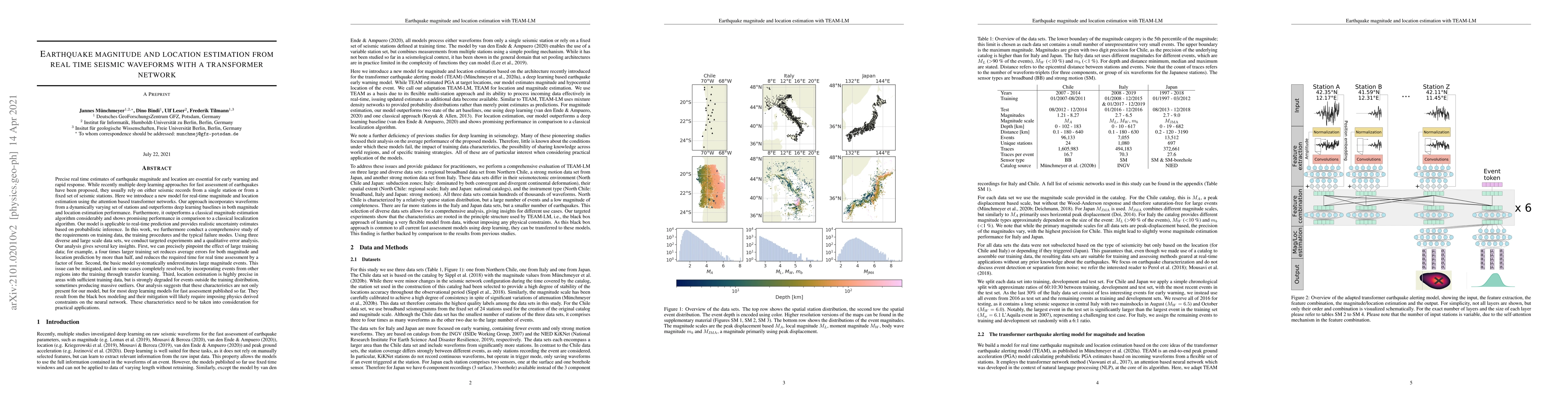 This paper proposes a transformer network for real-time earthquake magnitude and location estimation using waveforms from a dynamically varying set of stations, outperforming existing deep learning and classical methods. The study highlights the importance of large training datasets and transfer learning for mitigating systematic underestimation of large magnitude events, and notes that precise location estimation depends heavily on training data coverage.