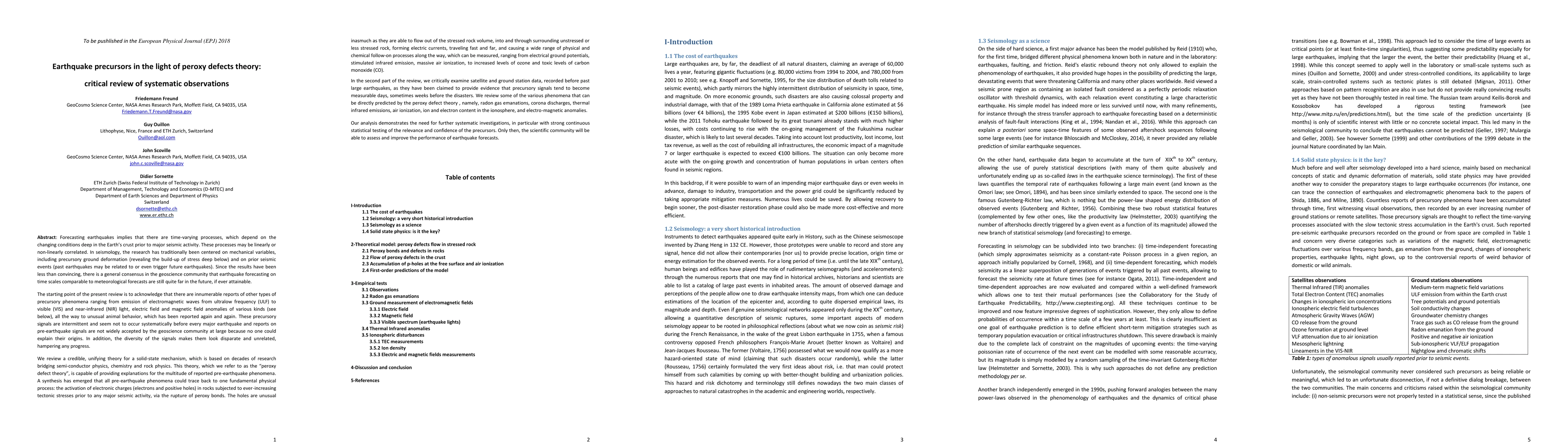 The starting point of the present review is to acknowledge that there are innumerable reports of non-seismic types of earthquake precursory phenomena that are intermittent and seem not to occur systematically, while associated reports are not widely accepted by the geoscience community at large because no one could explain their origins. We review a unifying theory for a solid-state mechanism, based on decades of research bridging semi-conductor physics, chemistry and rock physics. A synthesis has emerged that all pre-earthquake phenomena could trace back to one fundamental physical process: the activation of electronic charges (electrons and positive holes) in rocks subjected to ever-increasing tectonic stresses prior to any major seismic activity, via the rupture of peroxy bonds. In the second part of the review, we critically examine satellite and ground station data, recorded before past large earthquakes, as they have been claimed to provide evidence that precursory signals tend to become measurable days, sometimes weeks before the disasters. We review some of the various phenomena that can be directly predicted by the peroxy defect theory , namely, radon gas emanations, corona discharges, thermal infrared emissions, air ionization, ion and electron content in the ionosphere, and electro-magnetic anomalies. Our analysis demonstrates the need for further systematic investigations, in particular with strong continuous statistical testing of the relevance and confidence of the precursors. Only then, the scientific community will be able to assess and improve the performance of earthquake forecasts.
