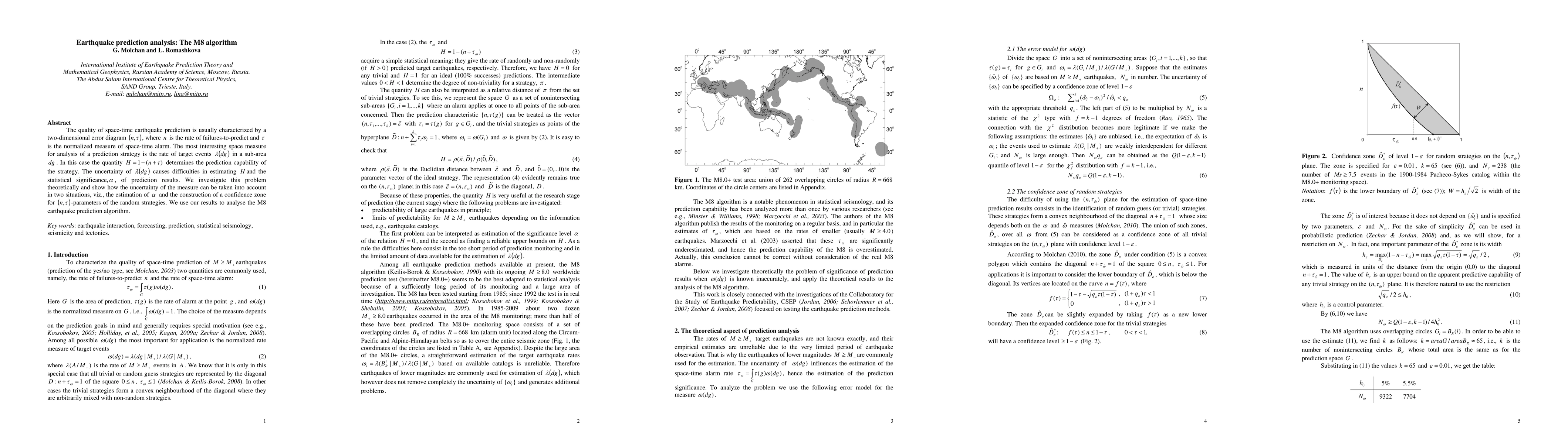 This paper analyzes earthquake prediction methods, specifically the M8 algorithm, by introducing a two-dimensional error diagram (n,tau) to evaluate prediction quality. It addresses uncertainties in estimating prediction capability (H) and statistical significance (alfa) due to event rate (m(dg)) fluctuations in sub-areas. The research provides theoretical solutions for accounting for these uncertainties in estimating alfa and constructing confidence zones for (n,tau)-parameters of random prediction strategies.