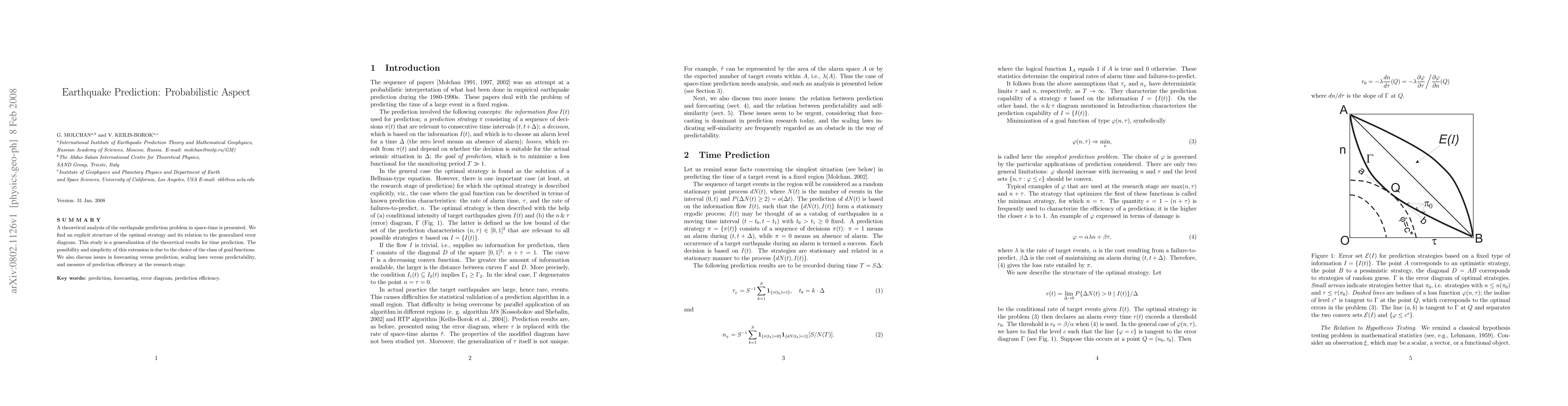 This paper presents a theoretical analysis of earthquake prediction in space-time, identifying an optimal strategy's structure and its relation to the generalized error diagram. It generalizes time-based prediction results and explores the differences between forecasting and prediction, scaling laws, and prediction efficiency.