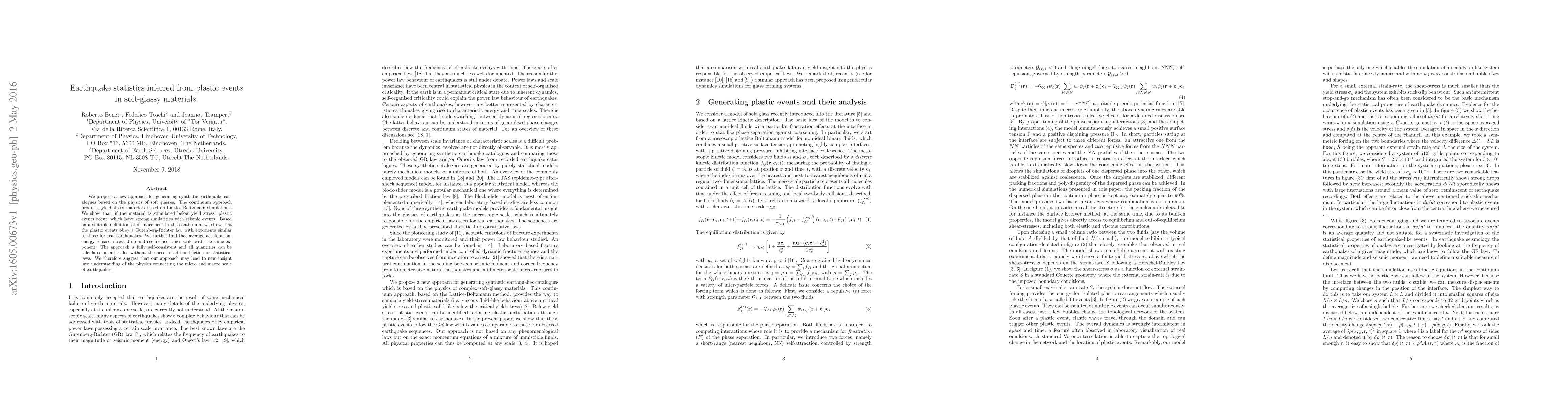 This paper introduces a synthetic earthquake model using Lattice-Boltzmann simulations of soft-glassy materials, showing that plastic events in these materials mimic seismic events and follow a Gutenberg-Richter law, offering a new perspective on the physics of earthquake generation.