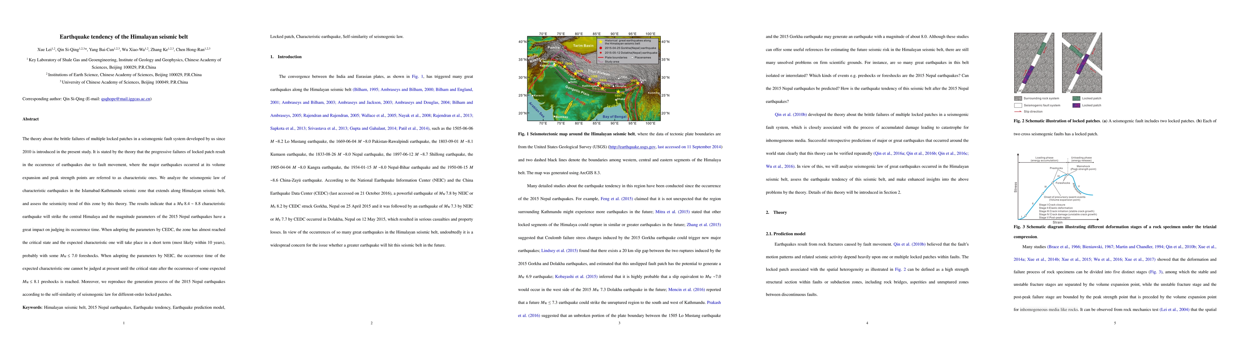 The theory about the brittle failures of multiple locked patches in a seismogenic fault system developed by us since 2010 is introduced in the present study. It is stated by the theory that the progressive failures of locked patch result in the occurrence of earthquakes due to fault movement, where the major earthquakes occurred at its volume expansion and peak strength points are referred to as characteristic ones. We analyze the seismogenic law of characteristic earthquakes in the Islamabad-Kathmandu seismic zone that extends along Himalayan seismic belt, and assess the seismicity trend of this zone by this theory. The results indicate that a MW 8.4 ~ 8.8 characteristic earthquake will strike the central Himalaya and the magnitude parameters of the 2015 Nepal earthquakes have a great impact on judging its occurrence time. When adopting the parameters by CEDC, the zone has almost reached the critical state and the expected characteristic one will take place in a short term (most likely within 10 years), probably with some less than or equal to MW 7.0 foreshocks. When adopting the parameters by NEIC, the occurrence time of the expected characteristic one cannot be judged at present until the critical state after the occurrence of some expected less than or equal to MW 8.1 preshocks is reached. Moreover, we reproduce the generation process of the 2015 Nepal earthquakes according to the self-similarity of seismogenic law for different-order locked patches.