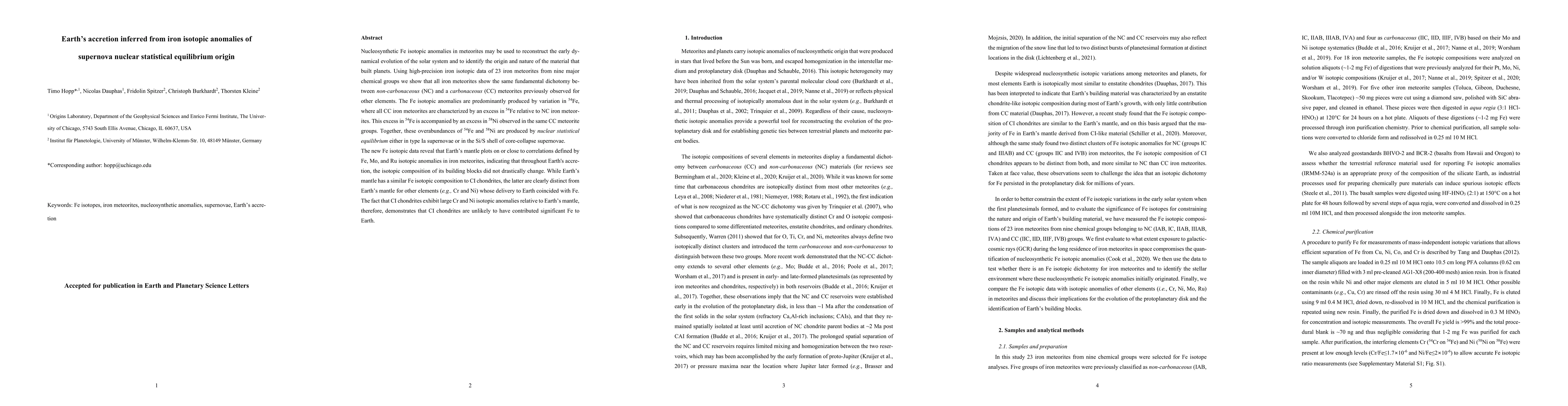 This research uses high-precision iron isotopic data from meteorites to infer Earth's accretion history, revealing that Earth's mantle isotopic composition closely matches that of iron meteorites, indicating consistent isotopic composition of its building blocks. CI chondrites, despite similar Fe isotopic composition, show distinct Cr and Ni isotopic anomalies, suggesting they did not significantly contribute iron to Earth.