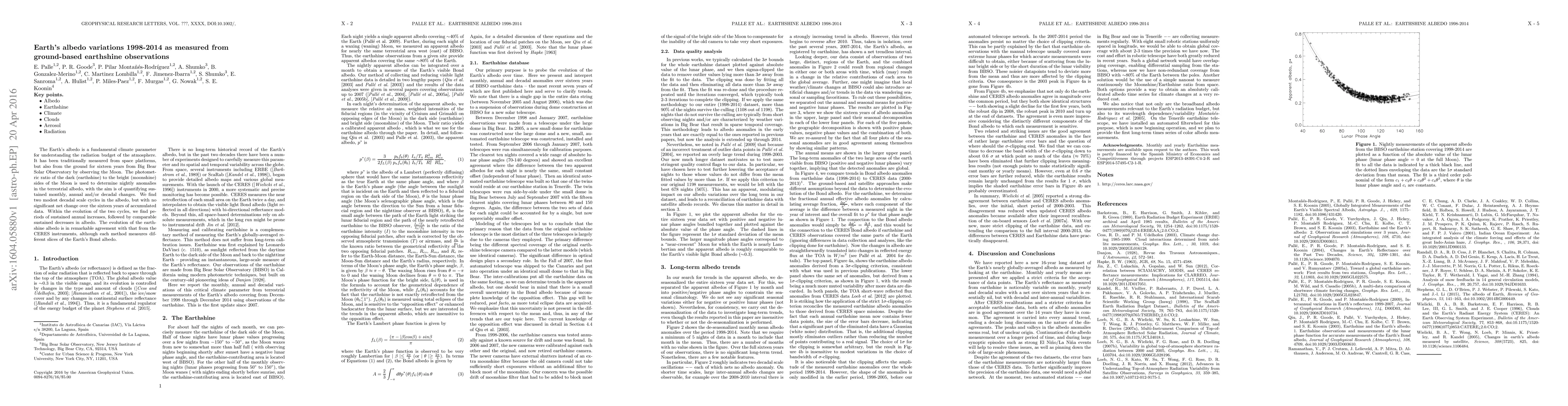The Earth's albedo is a fundamental climate parameter for understanding the radiation budget of the atmosphere. It has been traditionally measured from space platforms, but also from the ground for sixteen years from Big Bear Solar Observatory by observing the Moon. The photometric ratio of the dark (earthshine) to the bright (moonshine) sides of the Moon is used to determine nightly anomalies in the terrestrial albedo, with the aim is of quantifying sustained monthly, annual and/or decadal changes. We find two modest decadal scale cycles in the albedo, but with no significant net change over the sixteen years of accumulated data. Within the evolution of the two cycles, we find periods of sustained annual increases, followed by comparable sustained decreases in albedo. The evolution of the earthshine albedo is in remarkable agreement with that from the CERES instruments, although each method measures different slices of the Earth's Bond albedo.