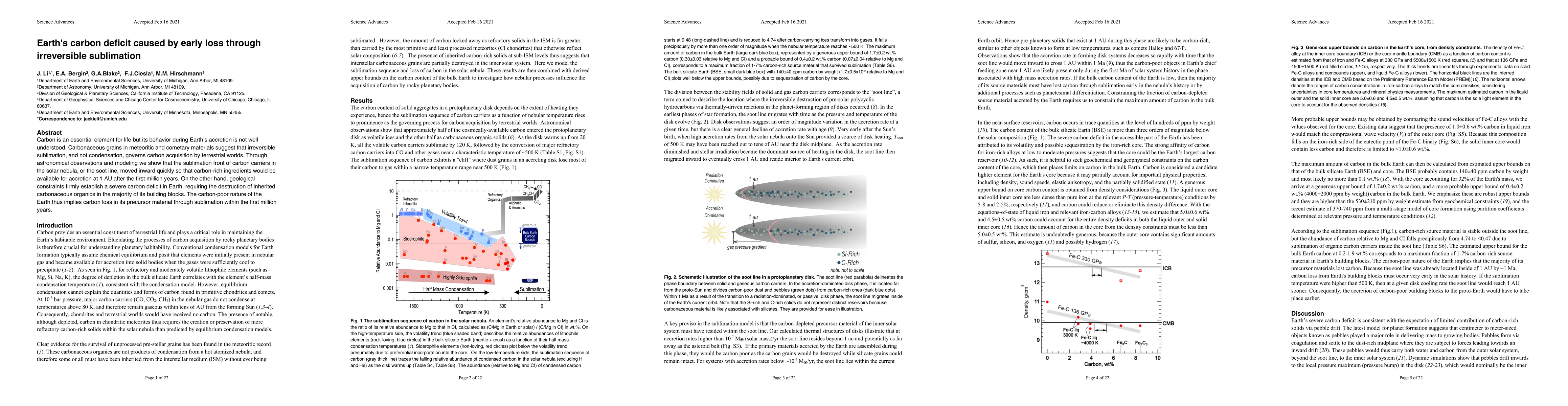 This research reveals that Earth's carbon deficit is due to early irreversible sublimation of carbon-rich materials in the solar nebula, which moved inward quickly, leaving insufficient carbon to be incorporated into Earth's building blocks. Geological evidence supports the conclusion that inherited carbonaceous organics were largely destroyed during Earth's formation.