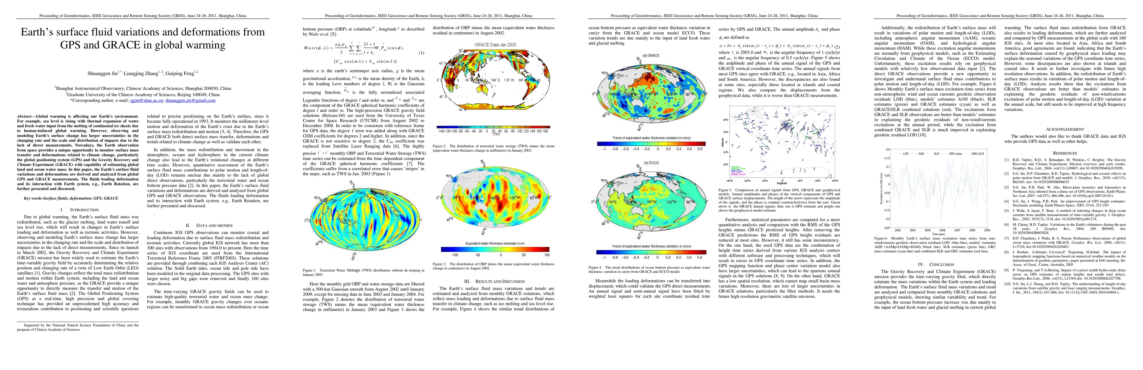 This paper analyzes Earth's surface fluid variations and deformations using GPS and GRACE data to monitor changes in sea level and land water mass due to global warming. It highlights the uncertainties in current models and discusses the interaction of fluid loading deformation with Earth's rotation.