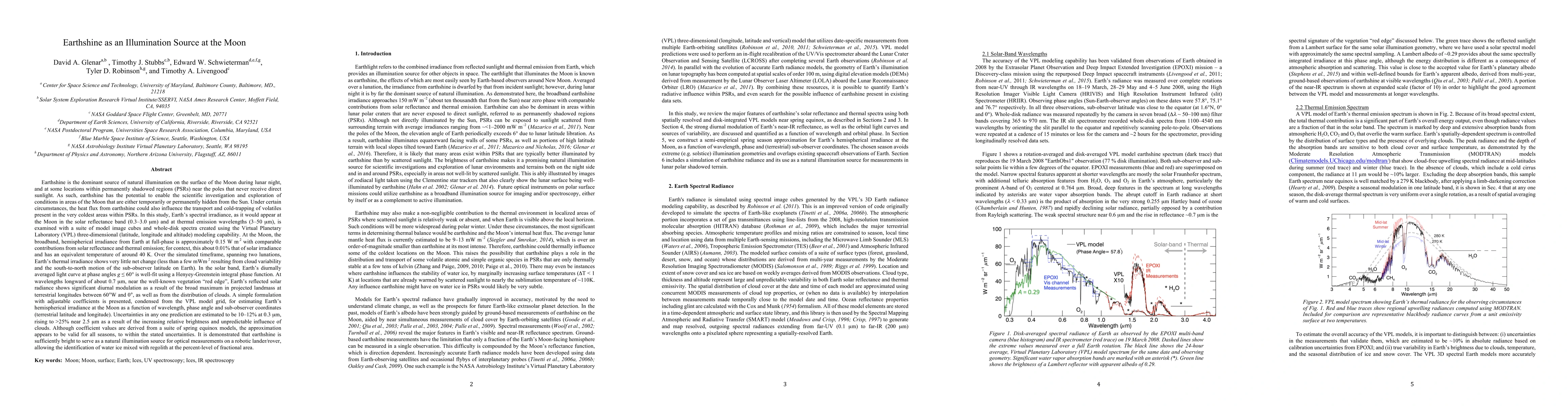 This study investigates Earthshine, the Earth's reflected light illuminating the Moon's surface during lunar night, finding it to be a significant illumination source, especially in permanently shadowed regions. The research models Earth's spectral radiance at the Moon, revealing a broadband, hemispherical irradiance of approximately 0.15 watts per square meter, sufficient for lunar exploration and influencing volatile transport.