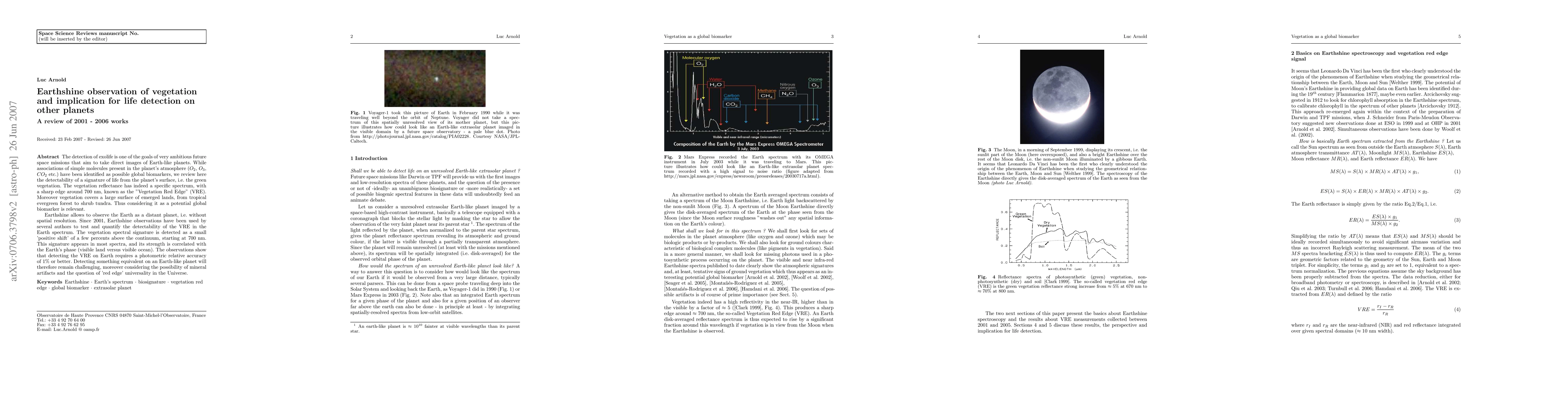 This paper reviews the use of Earthshine observations from 2001-2006 to detect the "Vegetation Red Edge" (VRE) as a potential global biomarker for life on Earth-like planets. It highlights the specific spectral signature of green vegetation and its correlation with Earth's phase, emphasizing the challenges in detecting this signature with the required photometric accuracy for exolife detection.