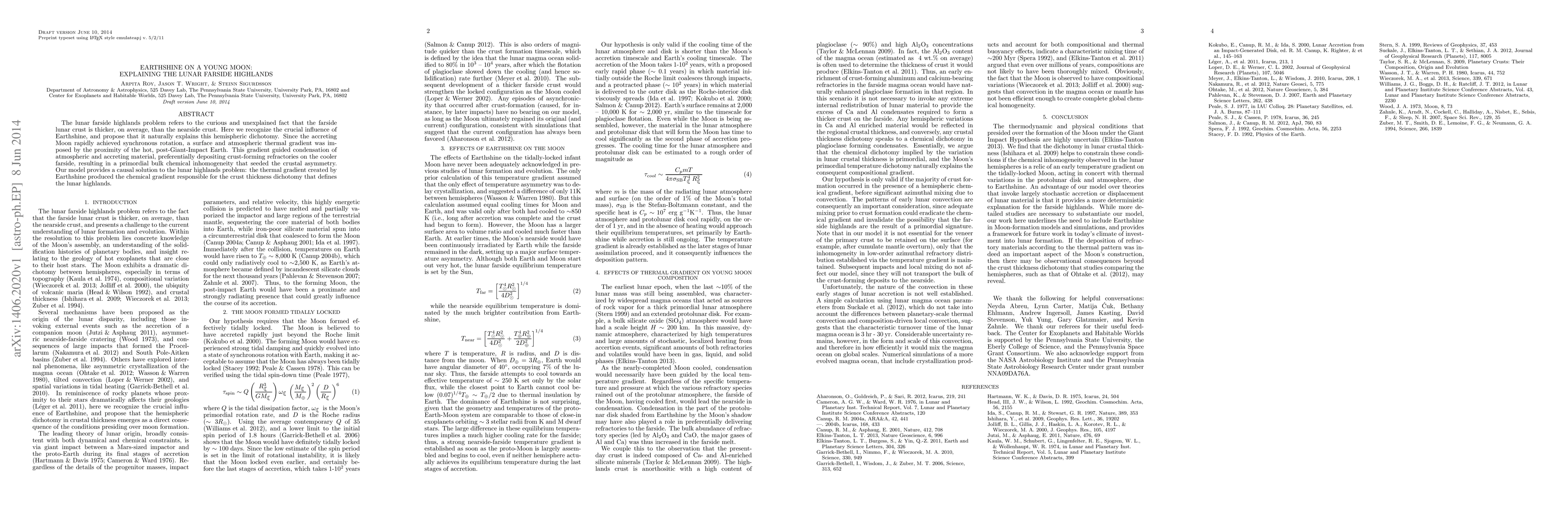 This paper proposes that Earthshine from a young, hot Earth created a thermal gradient that led to the preferential deposition of crust-forming materials on the cooler lunar farside, explaining the thicker crust and the hemispheric dichotomy of the lunar highlands. The model attributes the crustal asymmetry to the early thermal gradient imposed by Earth's proximity after the Moon's synchronous rotation.