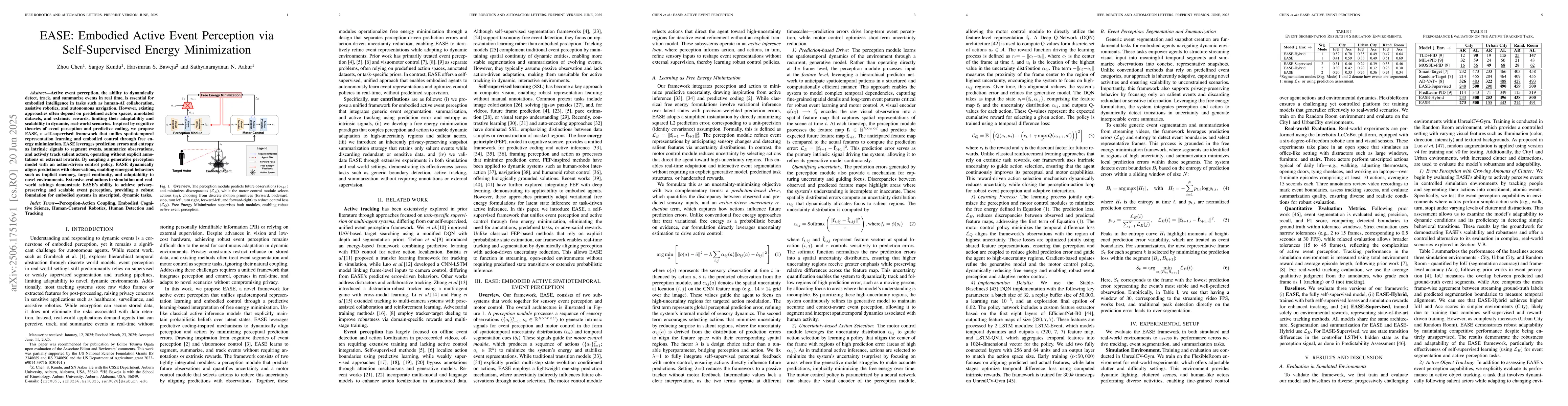 Active event perception, the ability to dynamically detect, track, and summarize events in real time, is essential for embodied intelligence in tasks such as human-AI collaboration, assistive robotics, and autonomous navigation. However, existing approaches often depend on predefined action spaces, annotated datasets, and extrinsic rewards, limiting their adaptability and scalability in dynamic, real-world scenarios. Inspired by cognitive theories of event perception and predictive coding, we propose EASE, a self-supervised framework that unifies spatiotemporal representation learning and embodied control through free energy minimization. EASE leverages prediction errors and entropy as intrinsic signals to segment events, summarize observations, and actively track salient actors, operating without explicit annotations or external rewards. By coupling a generative perception model with an action-driven control policy, EASE dynamically aligns predictions with observations, enabling emergent behaviors such as implicit memory, target continuity, and adaptability to novel environments. Extensive evaluations in simulation and real-world settings demonstrate EASE's ability to achieve privacy-preserving and scalable event perception, providing a robust foundation for embodied systems in unscripted, dynamic tasks.
