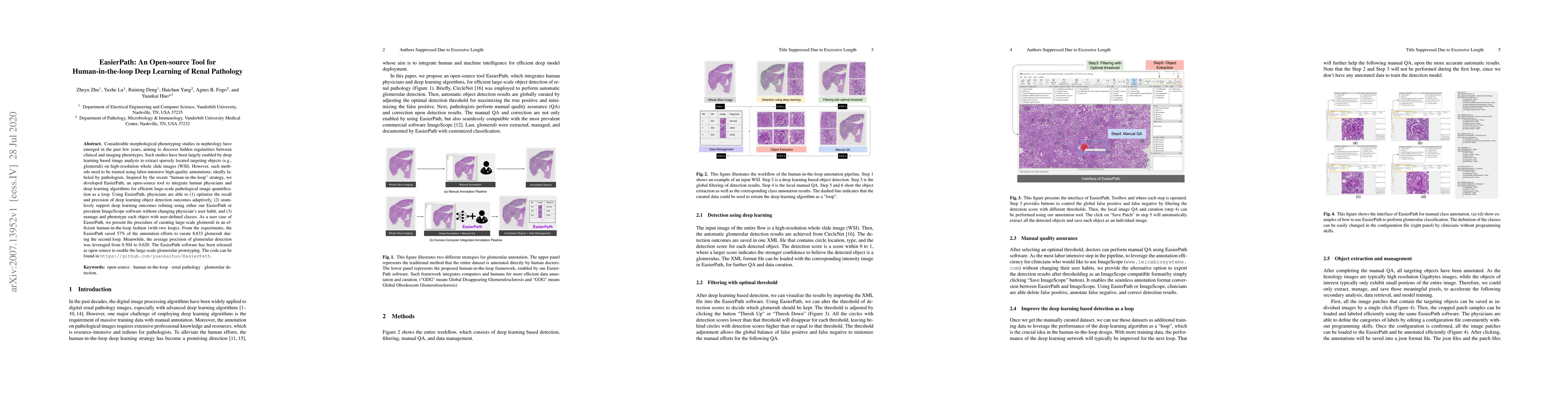 EasierPath is an open-source tool designed to integrate human physicians and deep learning for efficient large-scale pathological image analysis. It enables physicians to optimize deep learning outcomes and manage object phenotyping, significantly reducing annotation efforts and improving detection precision.