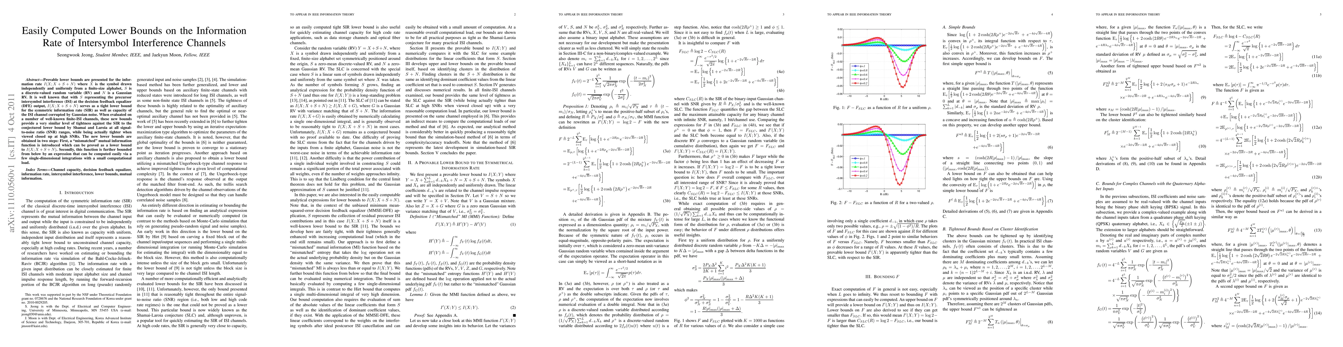 Provable lower bounds are presented for the information rate I(X; X+S+N) where X is the symbol drawn independently and uniformly from a finite-size alphabet, S is a discrete-valued random variable (RV) and N is a Gaussian RV. It is well known that with S representing the precursor intersymbol interference (ISI) at the decision feedback equalizer (DFE) output, I(X; X+S+N) serves as a tight lower bound for the symmetric information rate (SIR) as well as capacity of the ISI channel corrupted by Gaussian noise. When evaluated on a number of well-known finite-ISI channels, these new bounds provide a very similar level of tightness against the SIR to the conjectured lower bound by Shamai and Laroia at all signal-to-noise ratio (SNR) ranges, while being actually tighter when viewed closed up at high SNRs. The new lower bounds are obtained in two steps: First, a "mismatched" mutual information function is introduced which can be proved as a lower bound to I(X; X+S+N). Secondly, this function is further bounded from below by an expression that can be computed easily via a few single-dimensional integrations with a small computational load.