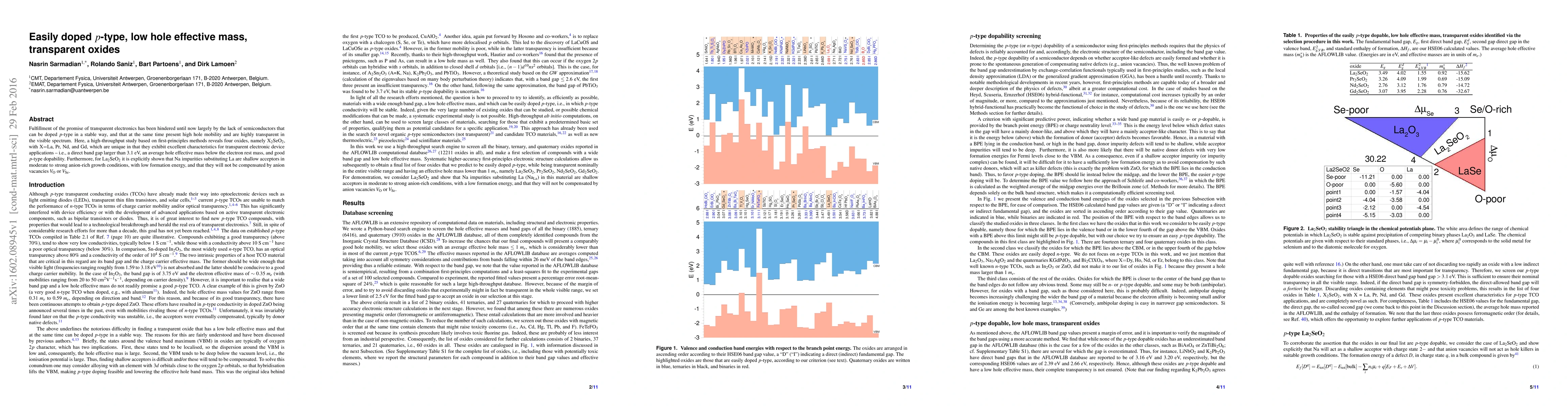 Fulfillment of the promise of transparent electronics has been hindered until now largely by the lack of semiconductors that can be doped p-type in a stable way, and that at the same time present high hole mobility and are highly transparent in the visible spectrum. Here, a high-throughput study based on first-principles methods reveals four oxides, namely X2SeO2, with X = La, Pr, Nd, and Gd, which are unique in that they exhibit excellent characteristics for transparent electronic device applications-i.e., a direct band gap larger than 3.1 eV, an average hole effective mass below the electron rest mass, and good p-type dopability. Furthermore, for La2SeO2 it is explicitly shown that Na impurities substituting La are shallow acceptors in moderate to strong anion-rich growth conditions, with low formation energy, and that they will not be compensated by anion vacancies VO or VSe.