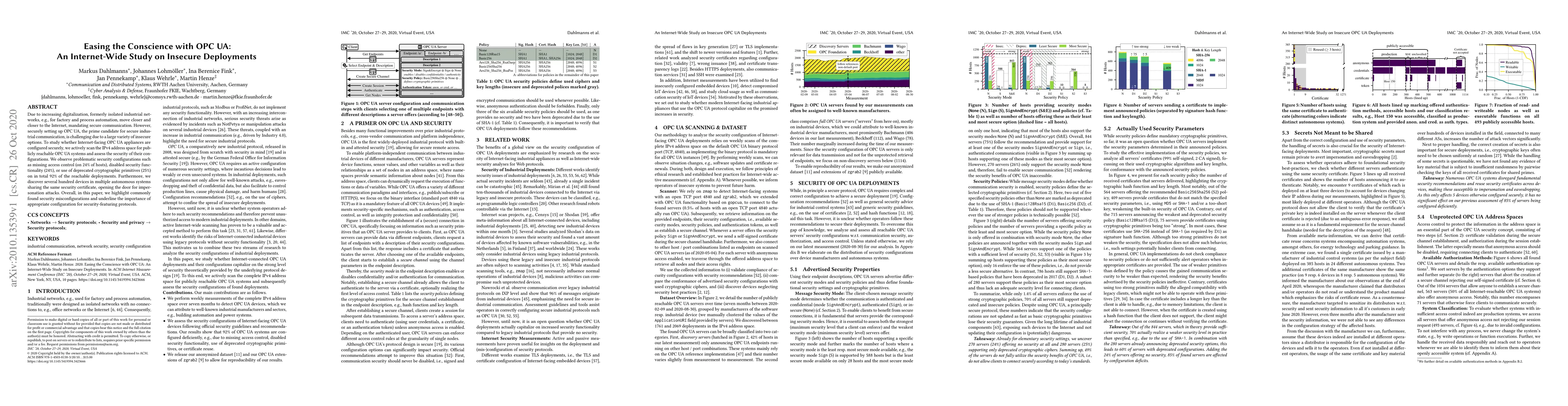 This study investigates the security configurations of publicly accessible OPC UA systems on the Internet, revealing widespread misconfigurations such as missing access control, disabled security features, and deprecated cryptographic methods, affecting 92% of the surveyed deployments. The research underscores the critical need for proper configuration of security-featuring protocols in industrial networks.
