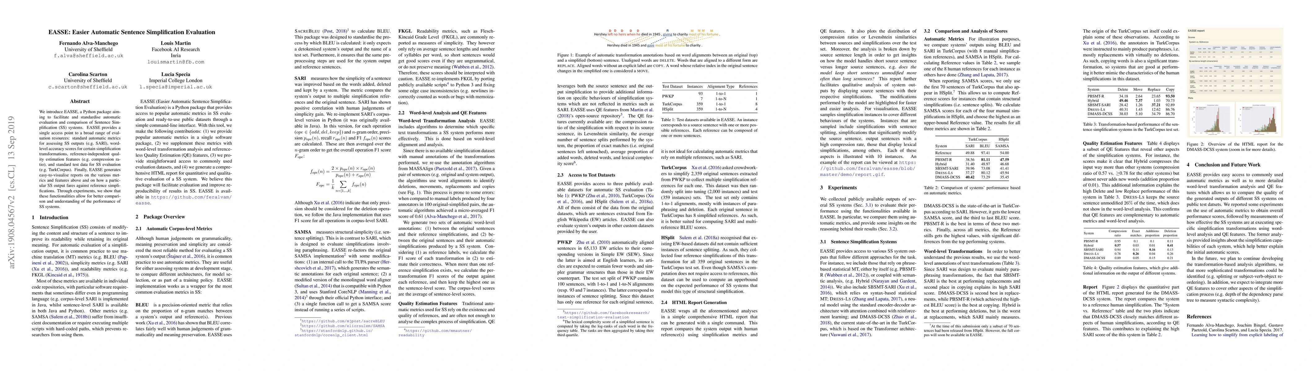 A new Python package called EASSE facilitates automatic evaluation of sentence simplification systems with a single access point to various metrics and features, enabling better comparison and understanding of their performance.