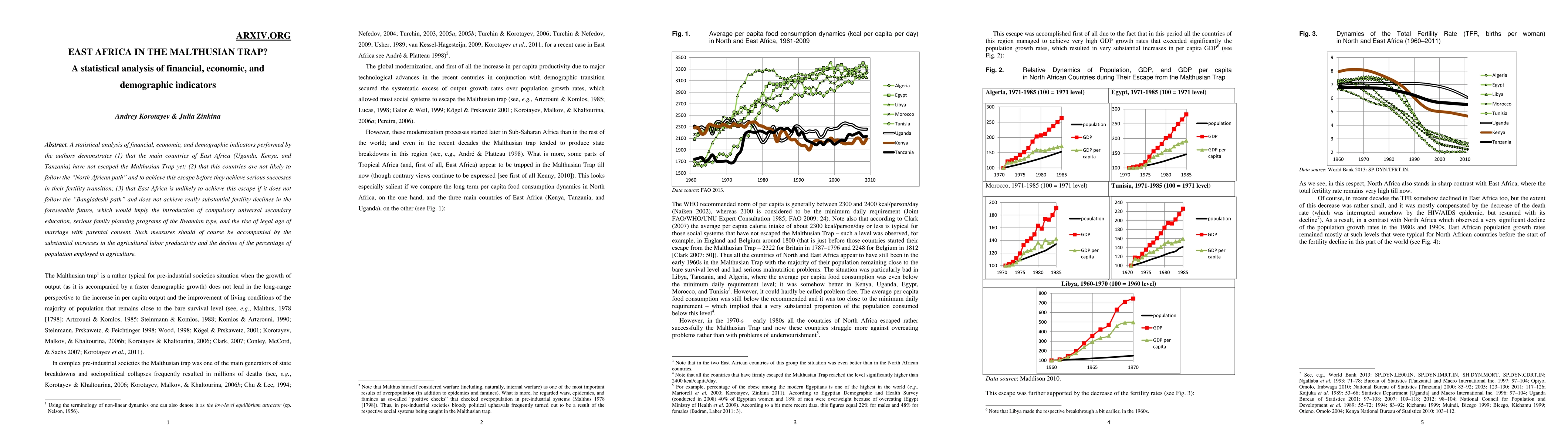 A statistical analysis of financial, economic, and demographic indicators performed by the authors demonstrates (1) that the main countries of East Africa (Uganda, Kenya, and Tanzania) have not escaped the Malthusian Trap yet; (2) that this countries are not likely to follow the "North African path" and to achieve this escape before they achieve serious successes in their fertility transition; (3) that East Africa is unlikely to achieve this escape if it does not follow the "Bangladeshi path" and does not achieve really substantial fertility declines in the foreseeable future, which would imply the introduction of compulsory universal secondary education, serious family planning programs of the Rwandan type, and the rise of legal age of marriage with parental consent. Such measures should of course be accompanied by the substantial increases in the agricultural labor productivity and the decline of the percentage of population employed in agriculture.