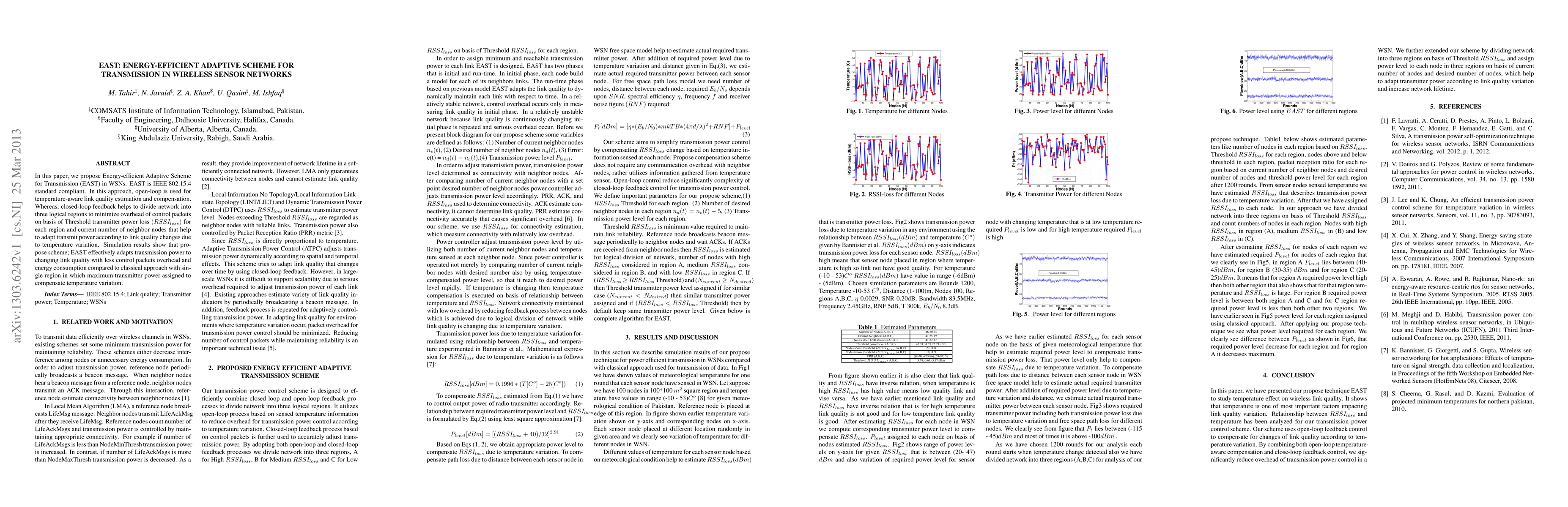 Title: EAST: Energy Efficient Adaptive Scheme for Transmission in Wireless Sensor Networks Summary: This paper introduces EAST, an adaptive transmission scheme for WSNs that minimizes energy consumption by adjusting transmit power based on temperature-aware link quality estimation and dividing the network into three regions to manage control packet overhead. Simulation results demonstrate EAST's effectiveness in reducing energy use compared to traditional single-region approaches.