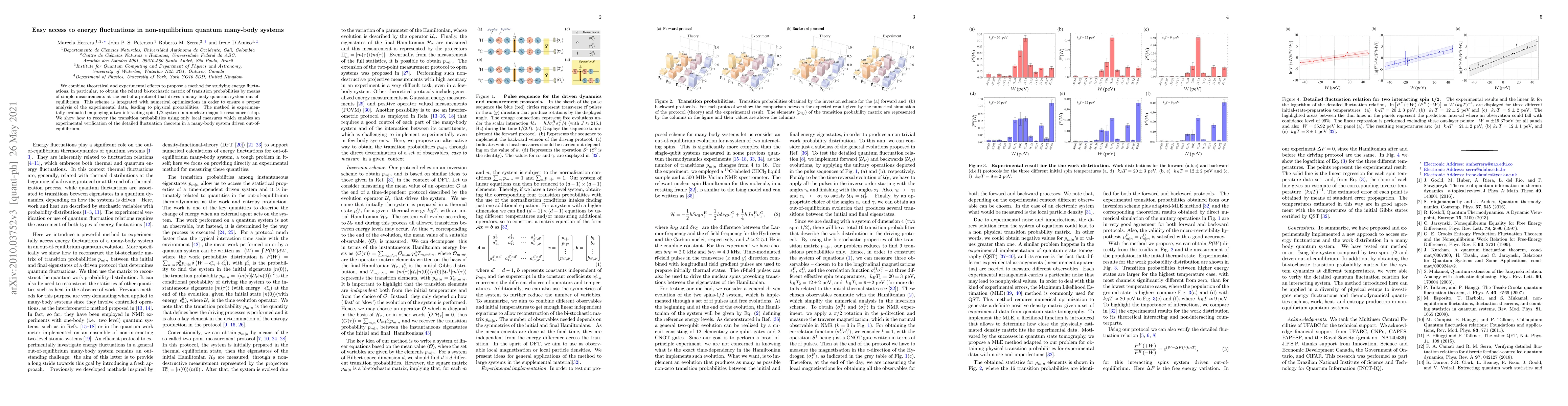 We combine theoretical and experimental efforts to propose a method for studying energy fluctuations, in particular, to obtain the related bi-stochastic matrix of transition probabilities by means of simple measurements at the end of a protocol that drives a many-body quantum system out-of-equilibrium. This scheme is integrated with numerical optimizations in order to ensure a proper analysis of the experimental data, leading to physical probabilities. The method is experimentally evaluated employing a two interacting spin-1/2 system in a nuclear magnetic resonance setup. We show how to recover the transition probabilities using only local measures which enables an experimental verification of the detailed fluctuation theorem in a many-body system driven out-of-equilibrium.