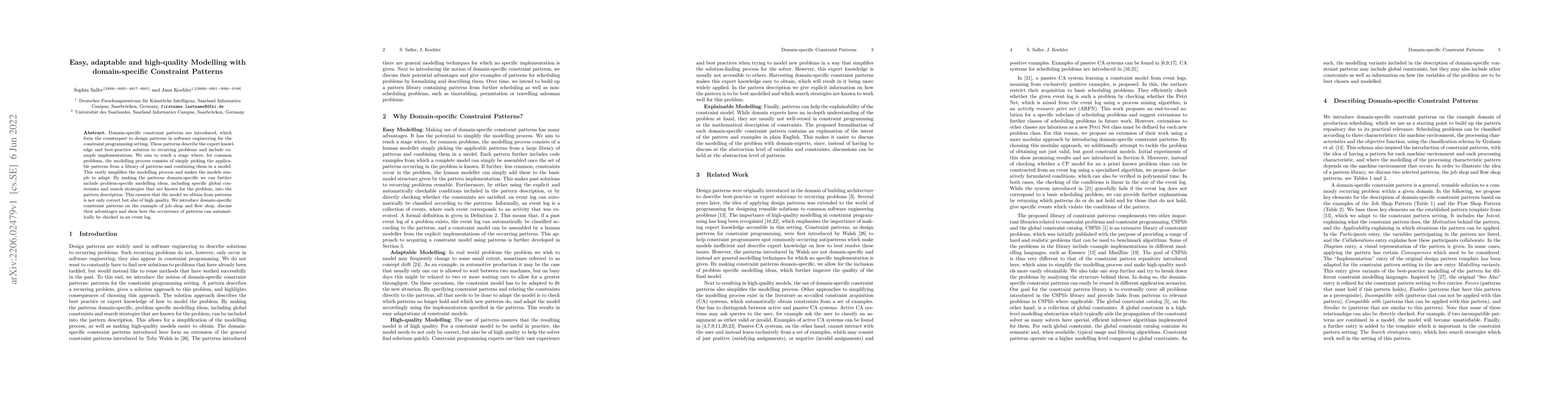 Researchers introduce domain-specific constraint patterns to simplify modeling in constraint programming, aiming to reduce complexity and increase model quality. By leveraging these patterns, models can be easily adapted and checked for accuracy.