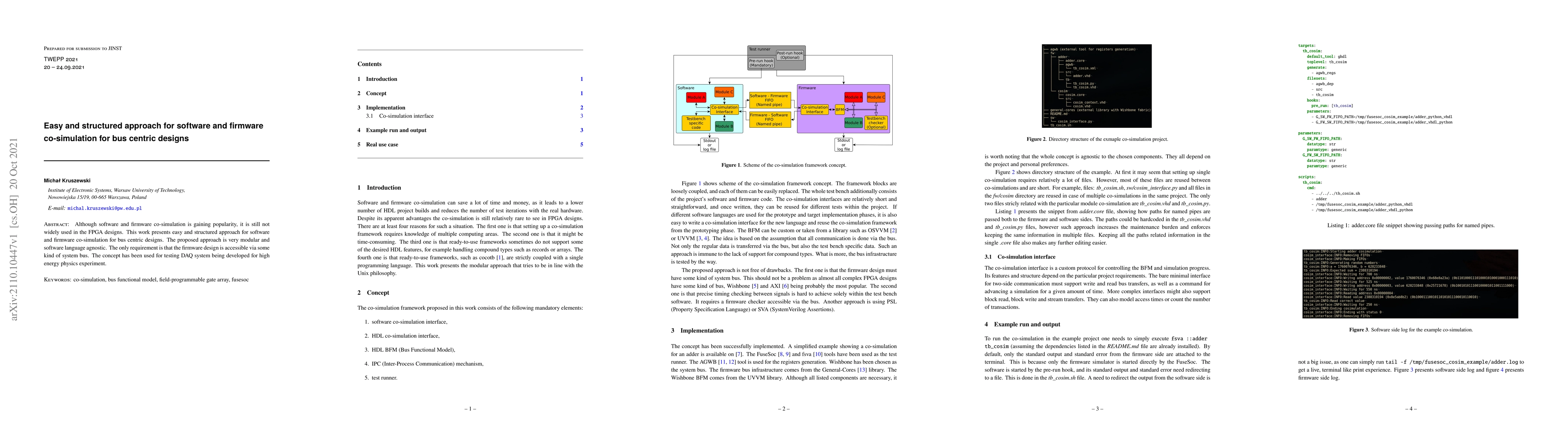 Although software and firmware co-simulation is gaining popularity, it is still not widely used in the FPGA designs. This work presents easy and structured approach for software and firmware co-simulation for bus centric designs. The proposed approach is very modular and software language agnostic. The only requirement is that the firmware design is accessible via some kind of system bus. The concept has been used for testing DAQ system being developed for high energy physics experiment.
