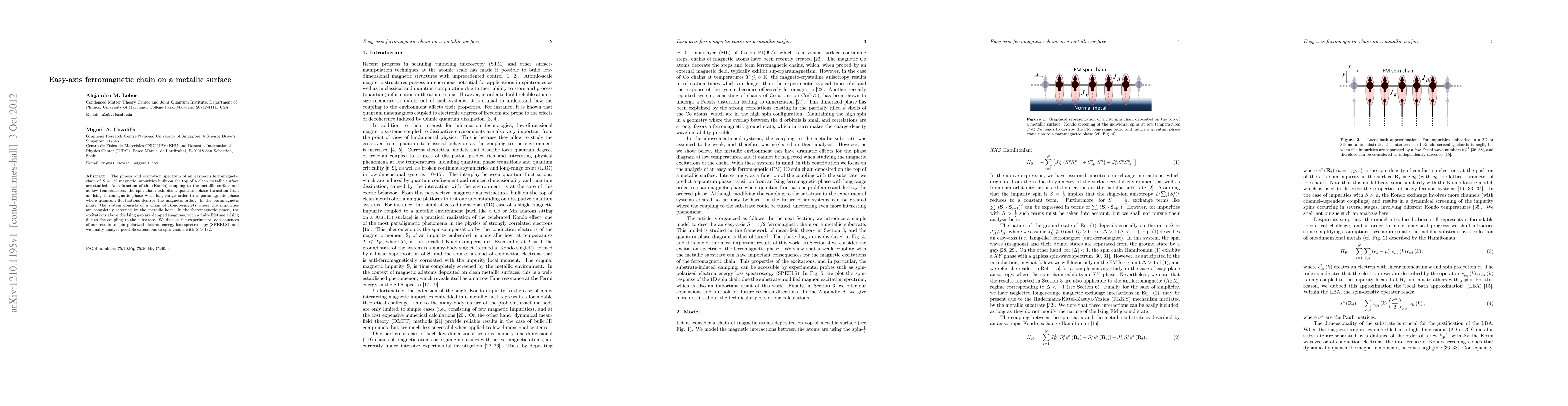 The phases and excitation spectrum of an easy-axis ferromagnetic chain of S=1/2 magnetic impurities built on the top of a clean metallic surface are studied. As a function of the (Kondo) coupling to the metallic surface and at low temperatures, the spin chain exhibits a quantum phase transition from an Ising ferromagnetic phase with long-range order to a paramagnetic phase where quantum fluctuations destroy the magnetic order. In the paramagnetic phase, the system consists of a chain of Kondo-singlets where the impurities are completely screened by the metallic host. In the ferromagnetic phase, the excitations above the Ising gap are damped magnons, with a finite lifetime arising due to the coupling to the substrate. We discuss the experimental consequences of our results to spin-polarized electron energy loss spectroscopy (SPEELS), and we finally analyze possible extensions to spin chains with S>1/2.
