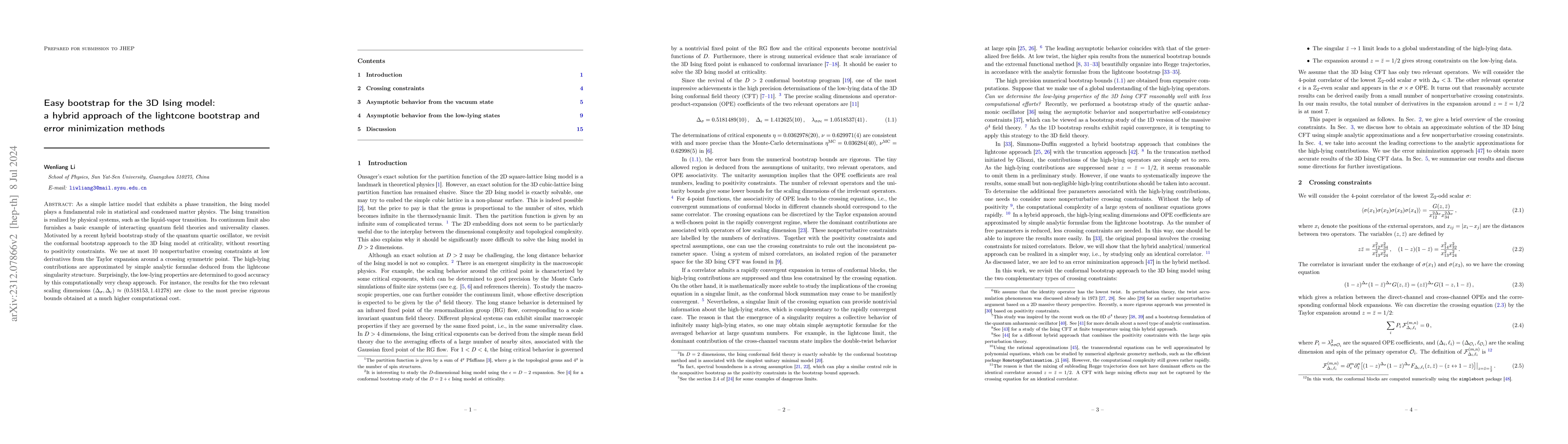 As a simple lattice model that exhibits a phase transition, the Ising model plays a fundamental role in statistical and condensed matter physics. Its continuum limit also furnishes a basic example of interacting quantum field theories and universality classes. Motivated by a recent bootstrap study of the quantum quartic oscillator, we revisit the conformal bootstrap approach to the 3D Ising model at criticality. Surprisingly, the low-lying properties are determined to good accuracy by simple asymptotic formulae and a few nonperturbative crossing constraints. For instance, the two relevant scaling dimensions $(\Delta_\sigma,\Delta_\epsilon)\approx (0.51810,1.4123)$ are close to the precise results from the bootstrap bounds.