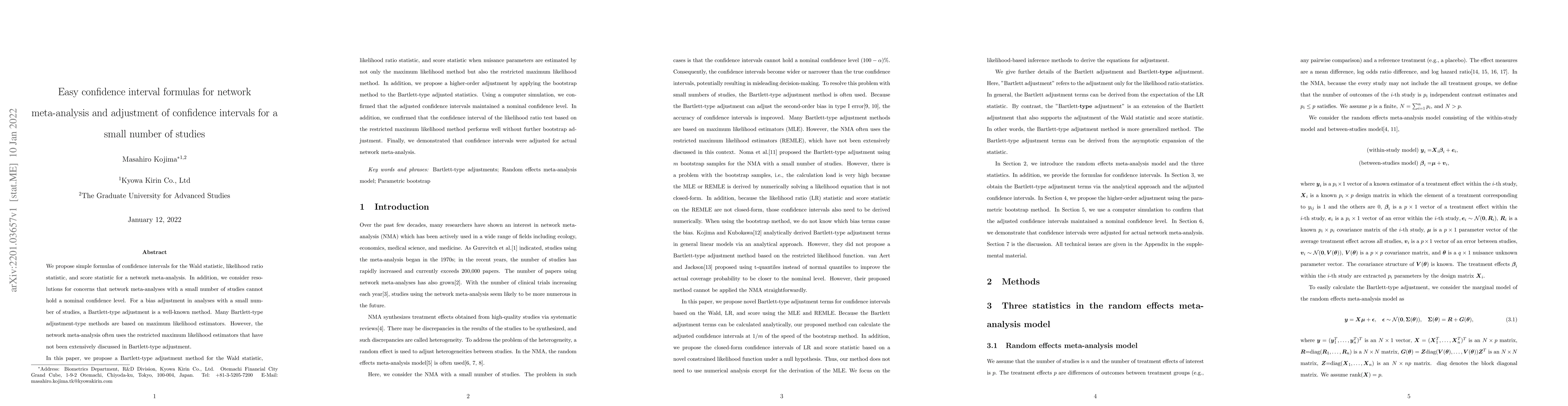 This paper proposes simple confidence interval formulas for network meta-analysis using the Wald, likelihood ratio, and score statistics, and introduces a Bartlett-type adjustment method for analyses with a small number of studies. The proposed method is shown to maintain nominal confidence levels through simulations and practical applications.