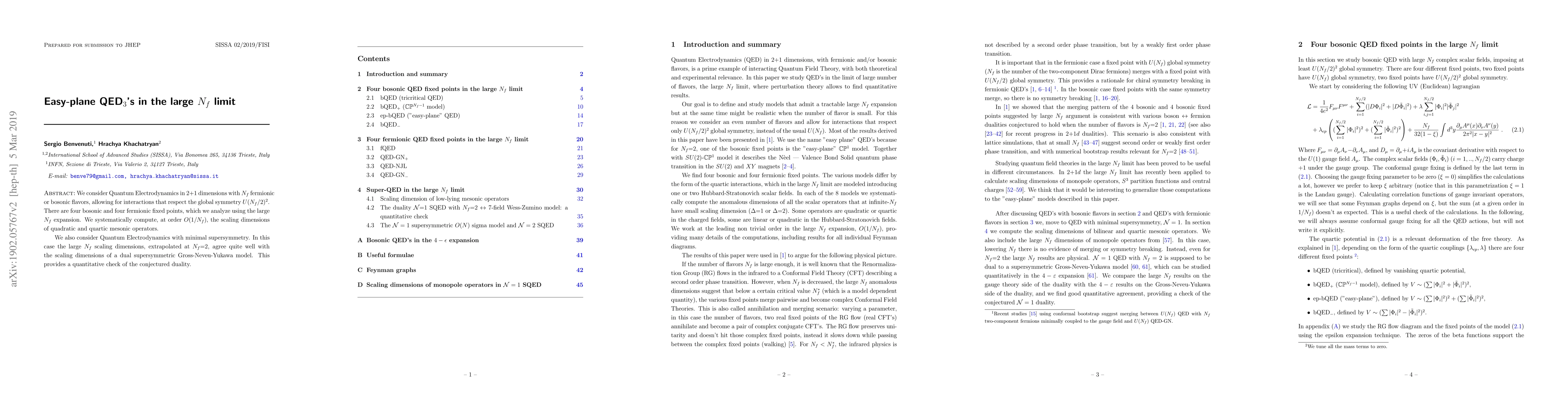 We consider Quantum Electrodynamics in $2{+}1$ dimensions with $N_f$ fermionic or bosonic flavors, allowing for interactions that respect the global symmetry $U(N_f/2)^2$. There are four bosonic and four fermionic fixed points, which we analyze using the large $N_f$ expansion. We systematically compute, at order $O(1/N_f)$, the scaling dimensions of quadratic and quartic mesonic operators. We also consider Quantum Electrodynamics with minimal supersymmetry. In this case the large $N_f$ scaling dimensions, extrapolated at $N_f{=}2$, agree quite well with the scaling dimensions of a dual supersymmetric Gross-Neveu-Yukawa model. This provides a quantitative check of the conjectured duality.