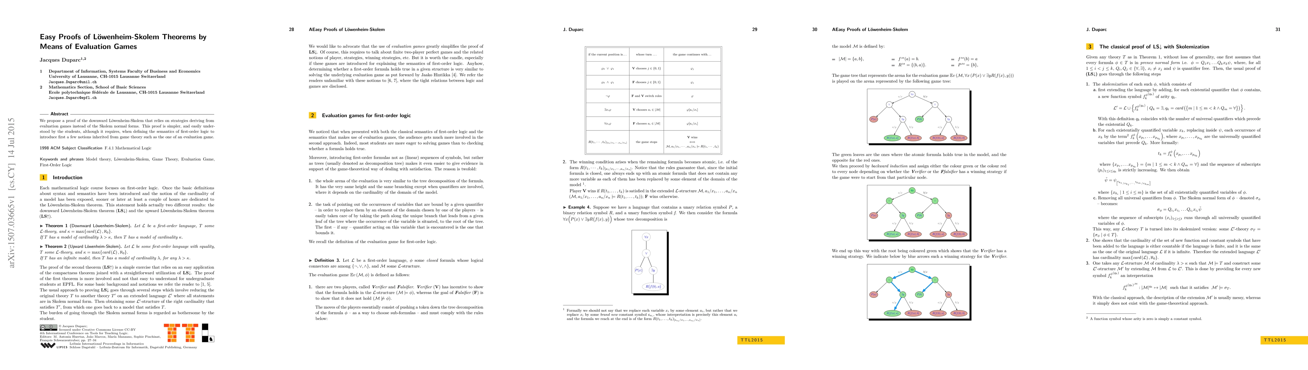 This paper presents a simplified proof of the downward Löwenheim-Skolem theorem using evaluation game strategies, making it more accessible to students compared to traditional methods. It introduces basic game theory concepts to define the semantics of first-order logic.